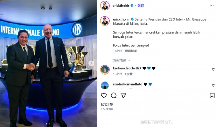 托希尔写道:“在意大利米兰,会见了国际米兰主席兼首席执行官朱塞佩·马洛塔先生。希望国际米兰能继续书写辉煌,赢得更多的冠军头衔。加油国米,直到永远!”