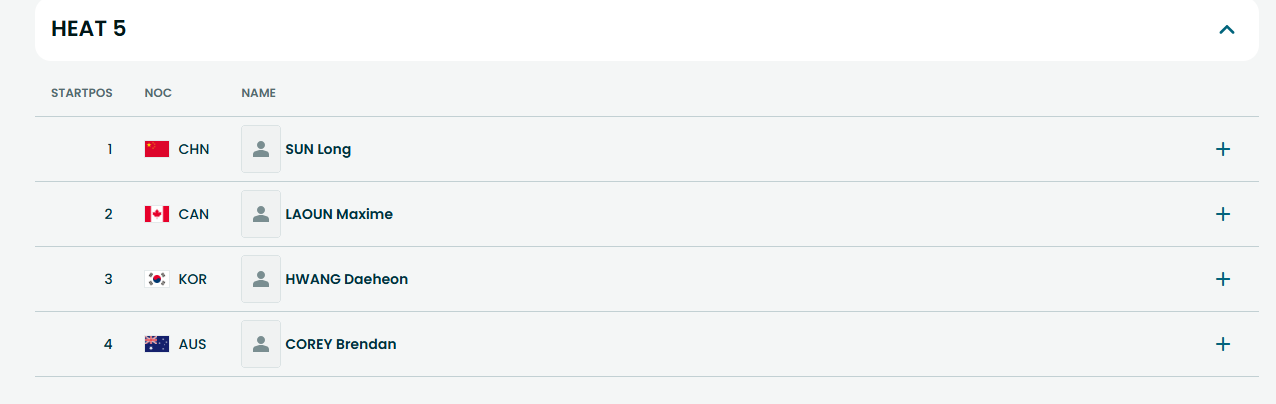 孙龙被分在5组1道登场,同组有韩国运动员黄大宪。