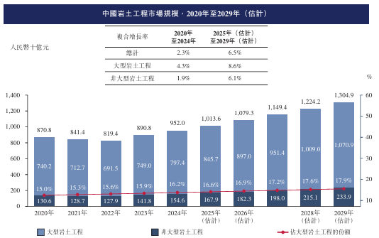 国有岩土工程企业占岩土工程市场的74.0%。2020年,中国国有岩土工程市场规模为人民币6,548亿元,于2024年增长至人民币7,045亿元,于该期间的复合增长率为1.8%。预计市场规模将于2025年达到人民币7,460亿元及于2029年达到人民币9,395亿元,2025年至2029年期间的复合增长率为5.9%。