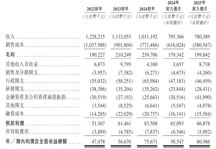 2022财年、2023财年、2024财年及2025年前九个月,该公司年╱期内利润及全面收益总额分别为4747.8万元、5667.6万元、7567.1万元、6098.6万元人民币。
