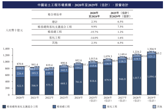 以营收计,中国岩土工程市场已由2020年的人民币8,708.0亿元增至2024年的人民币9,520.0亿元,于该期间的复合增长率为2.3%。由于中国宏观经济增速放缓,基础建设和房地产市场投资增速同步趋缓等因素,市场在2020年至2022年间出现下滑,随着基础建设和房地产投资回暖,于2023年及2024年恢复增长。展望未来,受中国政策及技术进步等因素推动,岩土工程行业市场规模将稳步增长,预计到2029年岩土工程市场空间将达到人民币13,049.0亿元,2025年至2029年的复合增长率为6.5%。