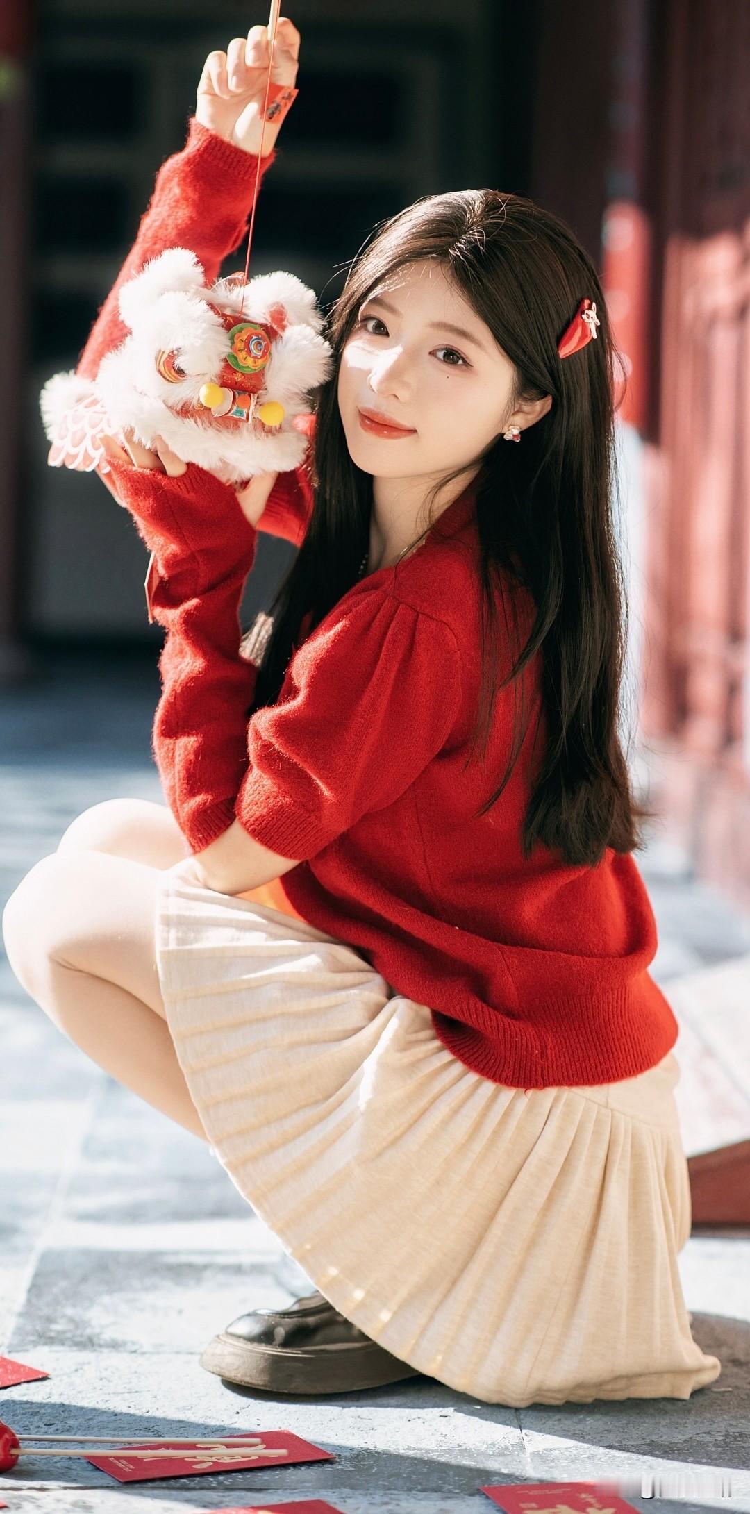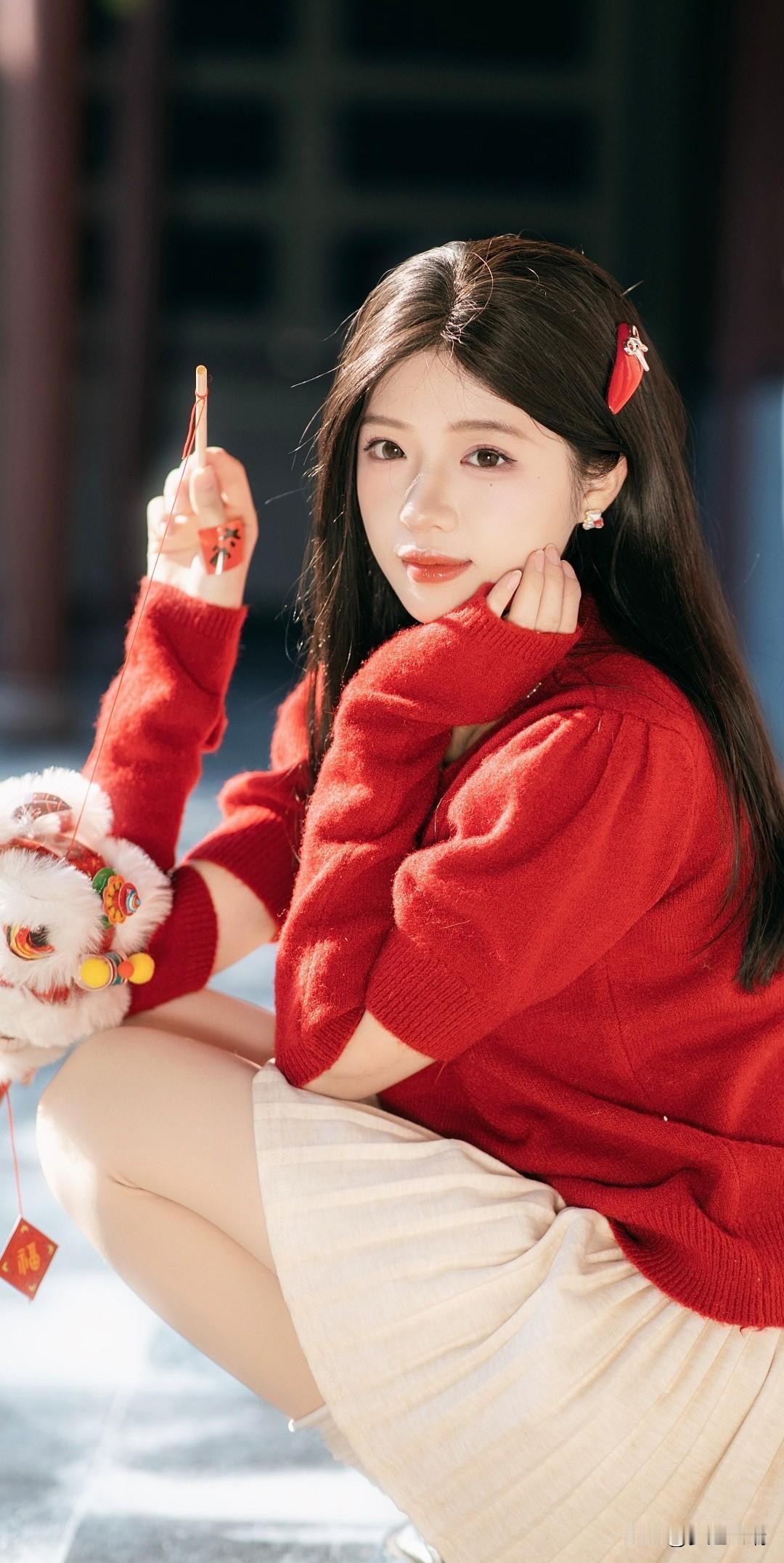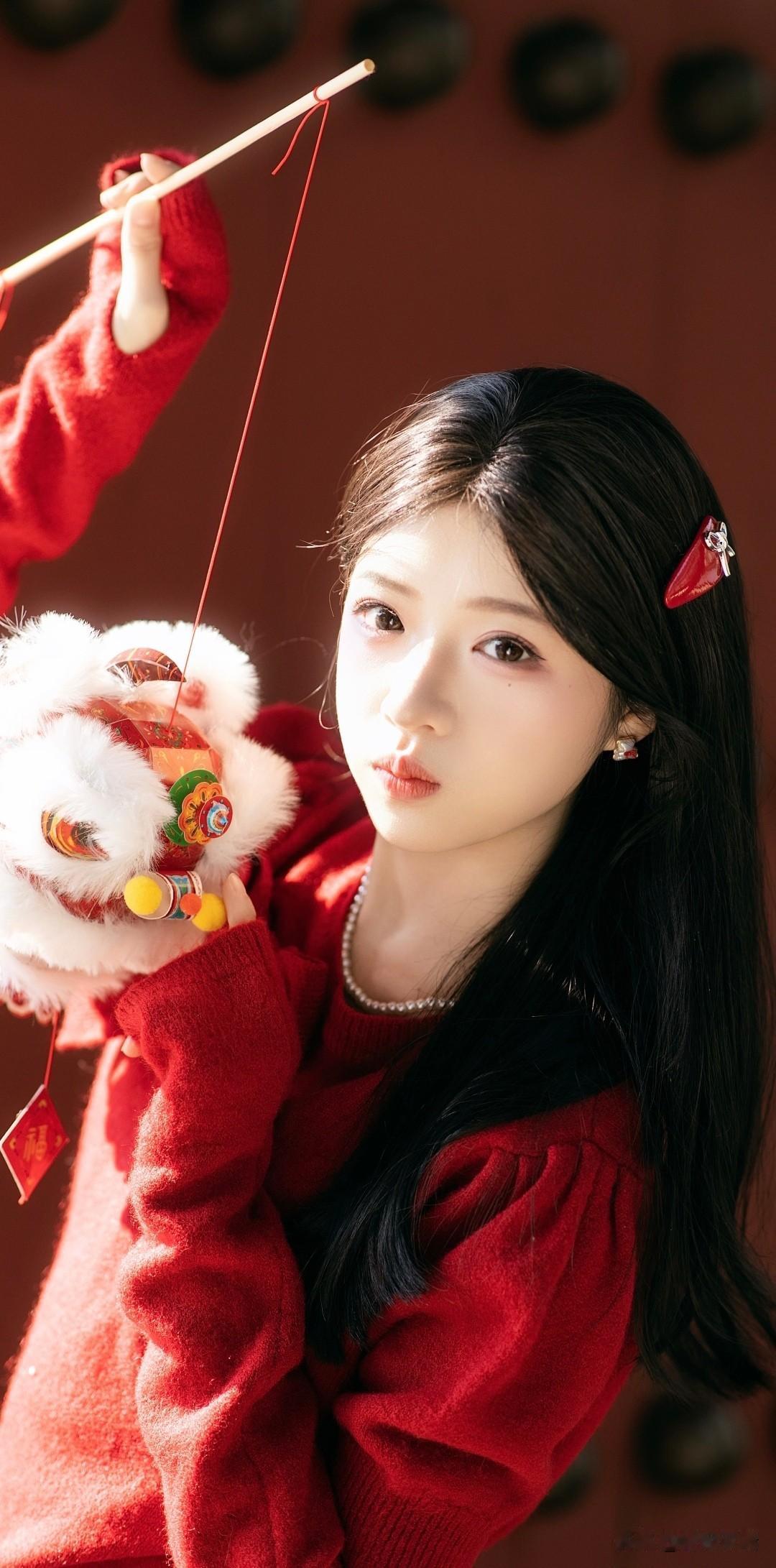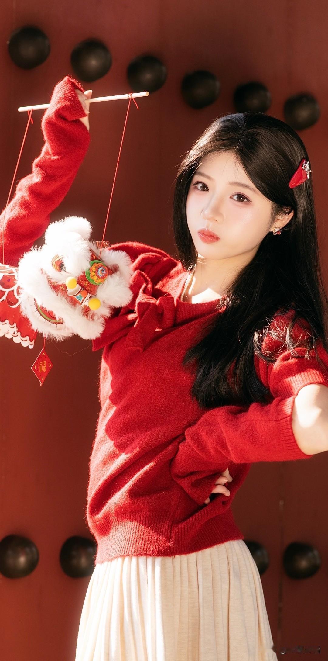 冬日暖阳下,红衣少女手捧吉祥玩具,微笑如初,㊗️大家新年快乐!