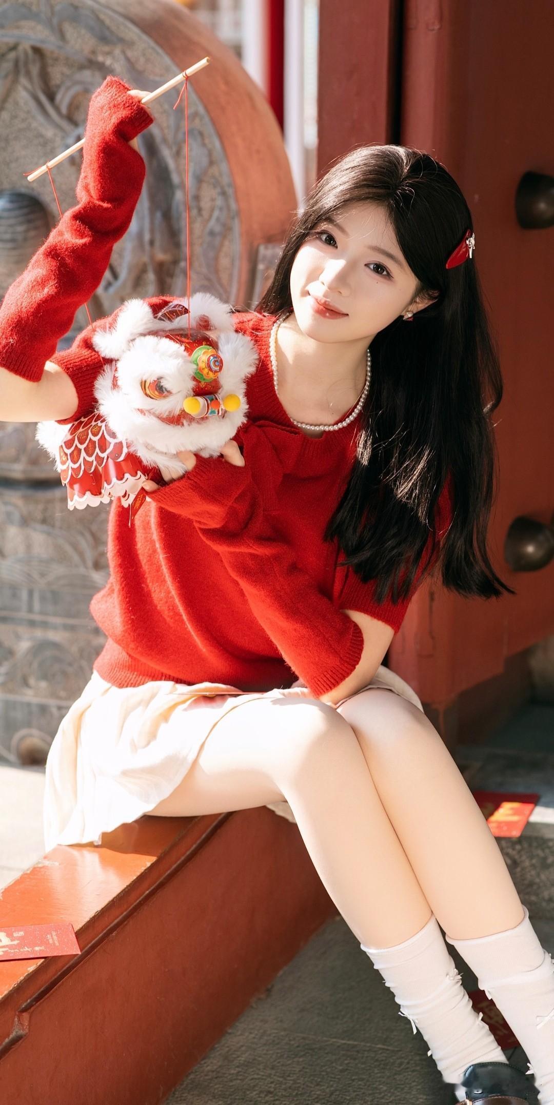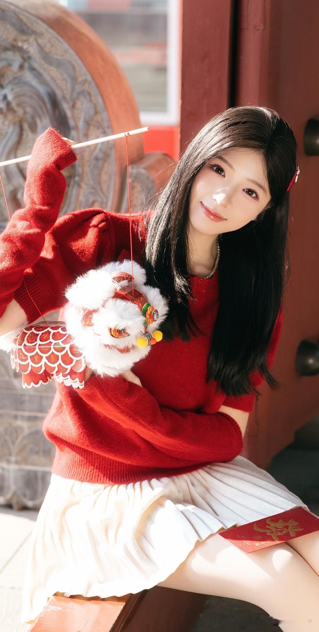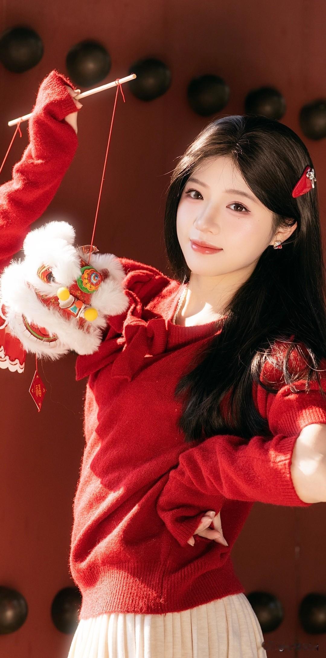 冬日暖阳下,红衣少女手捧吉祥玩具,微笑如初,㊗️大家新年快乐!
