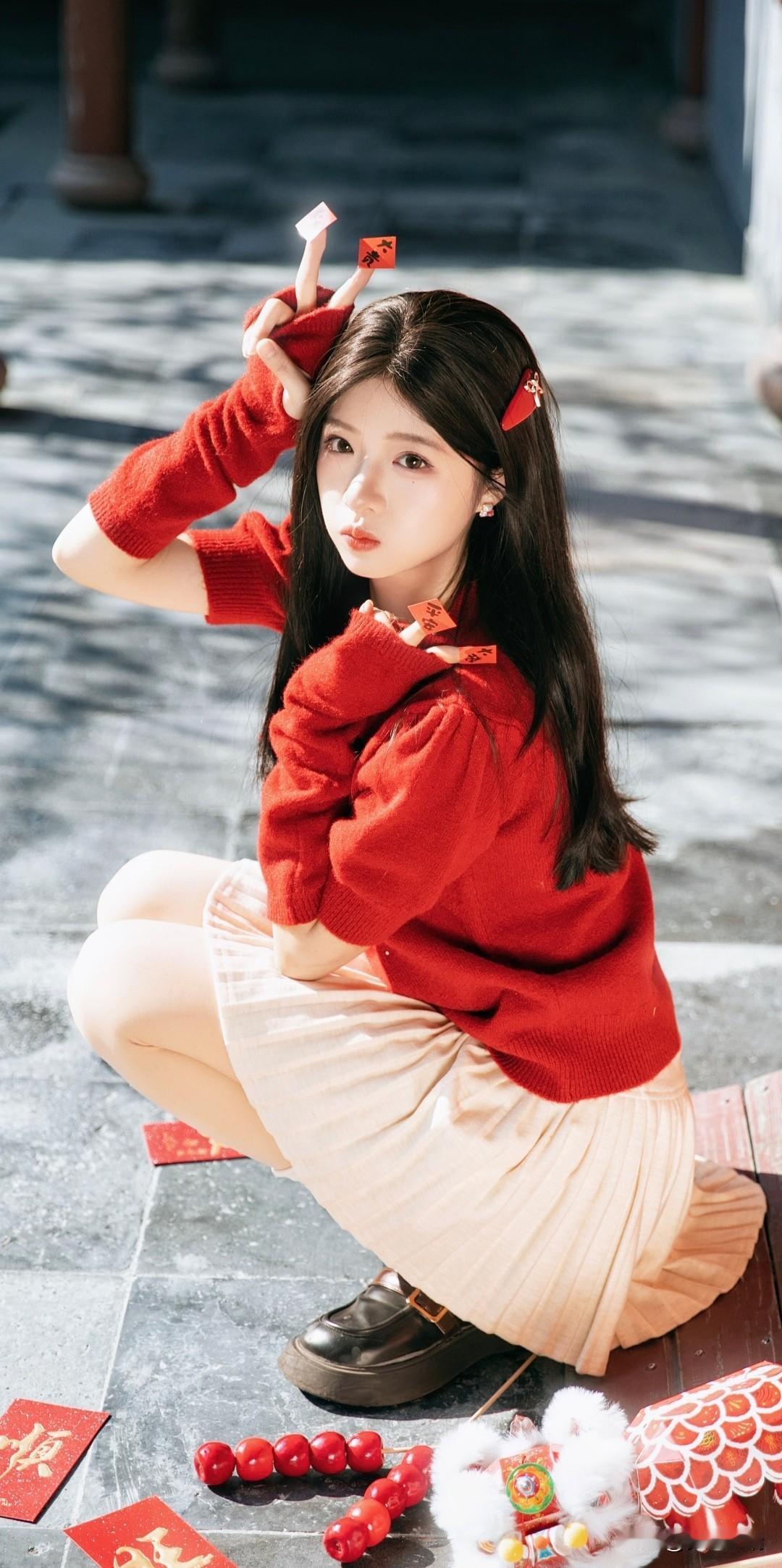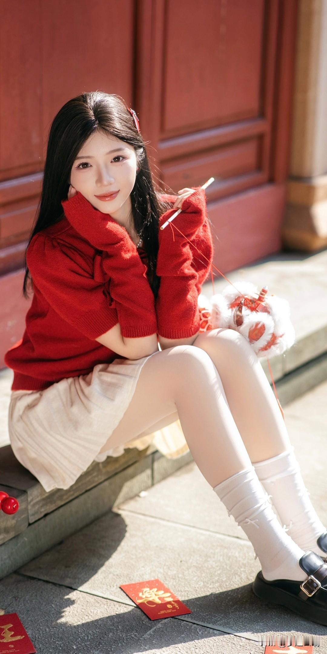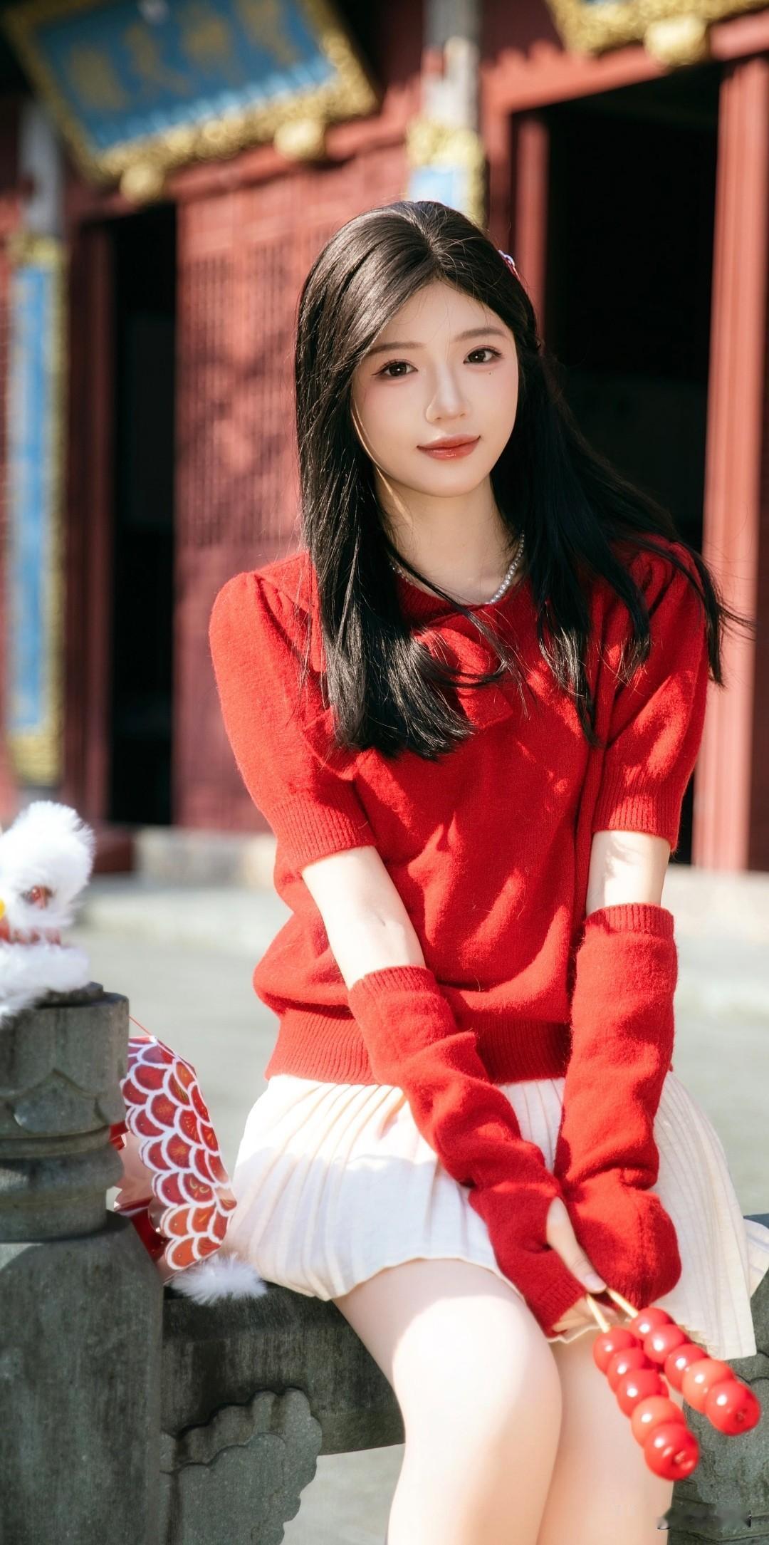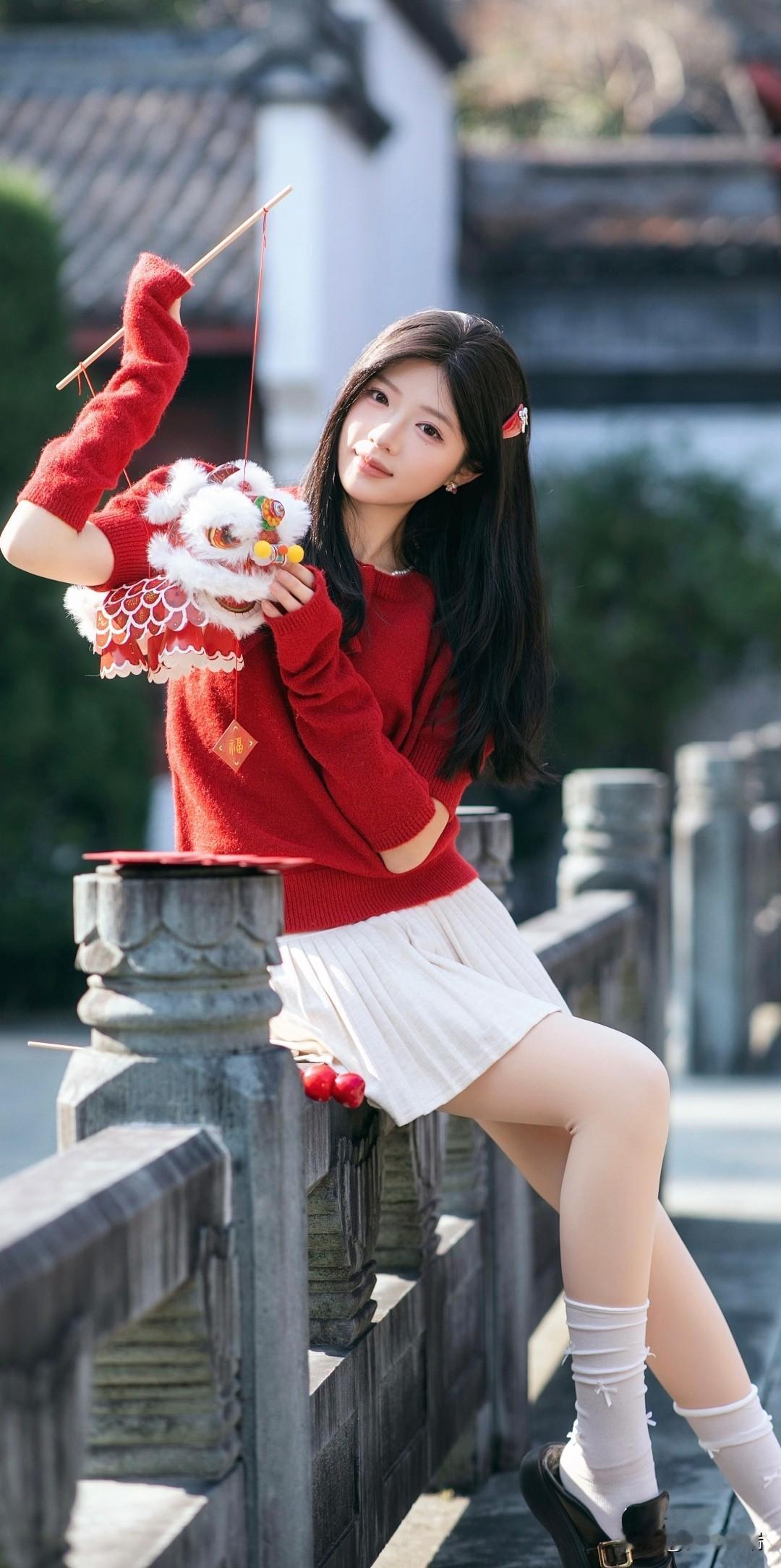 冬日暖阳下,红衣少女手捧吉祥玩具,微笑如初,㊗️大家新年快乐!