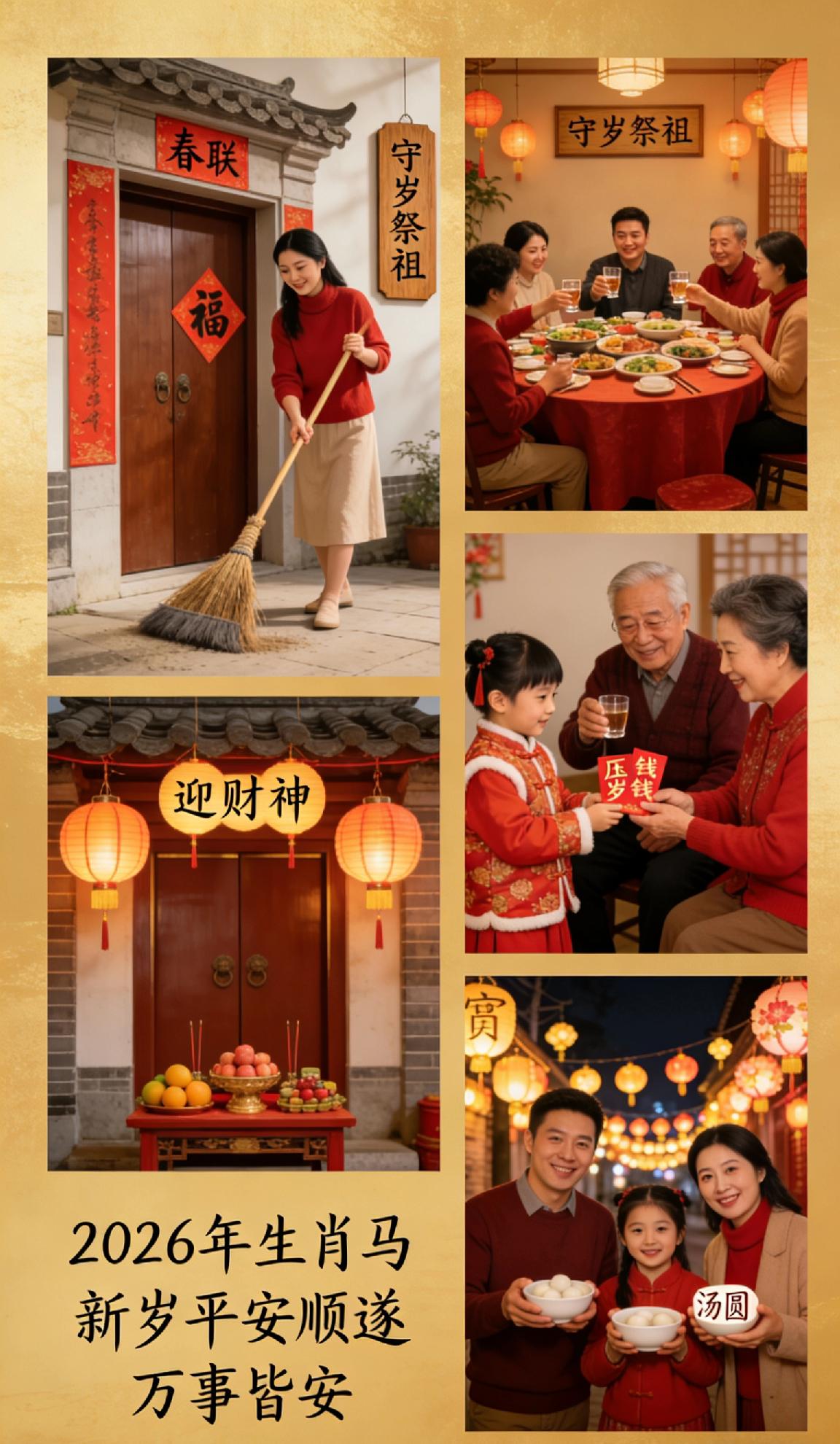 春节传统习俗|年味里的仪式感🧨 扫尘迎新、贴春联福字,辞旧岁迎新春。除夕阖家团圆吃年夜饭、守岁祭祖,初一拜年收压岁钱,初五迎财神,元宵赏花灯吃汤圆。每一项习俗,都是藏在烟火里的祝福,愿新岁平安顺遂,万事皆安✨ 春节传统习俗 年味仪式感