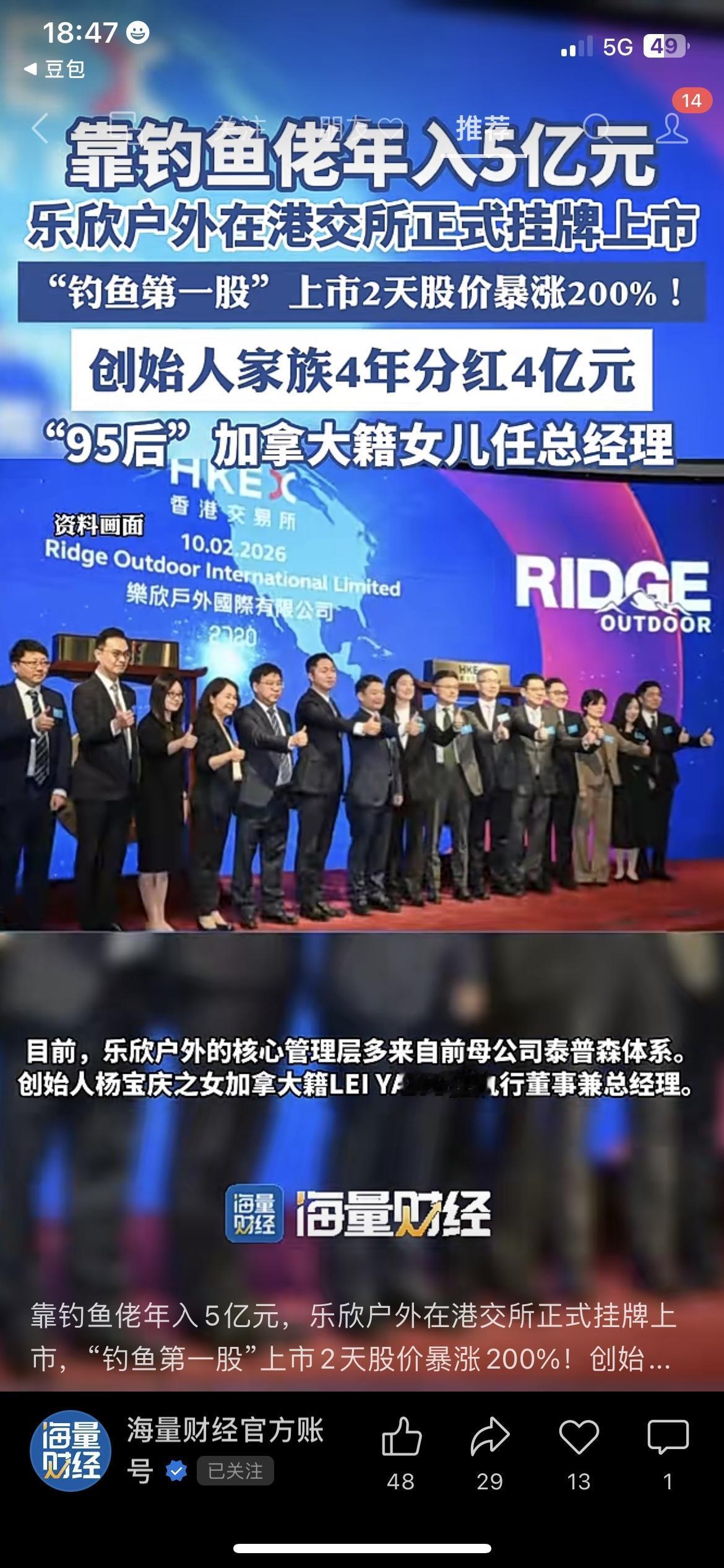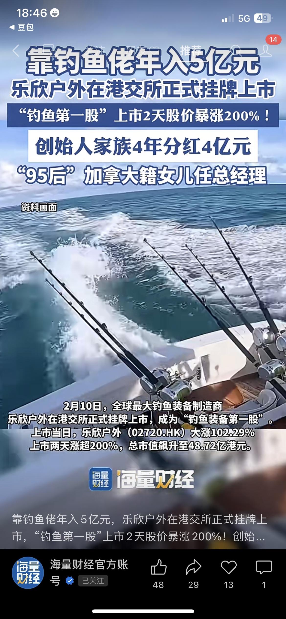 谁能想到,被好多人吐槽“不务正业”的钓鱼,居然撑起了一家快50亿的上市公司! 上市2天股价直接涨了200%,创始人家族4年分红4个亿,95后加拿大籍女儿直接当总经理,这生意真的超出太多人的想象! 2月10号,号称“全球最大钓鱼装备制造商”的乐欣户外,在港交所挂牌上市,成了实打实的“钓鱼装备第一股”。上市当天股价就涨了102.29%,才两天,涨幅就超200%,总市值直接飙到48.72亿港元。 说实话,好多人都觉得钓鱼是退休大爷的闲情逸致,是年轻人瞎花钱的爱好,可人家偏偏把这个小众赛道,做成了年入5亿的大生意。 更让人意外的是,这家公司几乎就是创始人家族的“私人金库”:杨宝庆家族持股高达94.77%,之前三年累计分红3.79亿元,最新一次又分走超6000万,4年合计4亿的分红,几乎全进了自家人的口袋。 懂的都懂,这哪里是钓鱼的人赚钱,分明是卖“钓鱼装备”给钓鱼佬的人,赚得盆满钵满。 现在的年轻人,不买房不买车,反而把钱砸在了钓鱼、露营这种能给情绪价值的轻户外爱好上。你以为人家是瞎花钱,殊不知背后藏着的,是闷声发大财的消费新风口。 最后严肃提醒:市场有风险,投资需谨慎,本文仅做行业分享,不构成任何投资建议。 你身边有没有沉迷钓鱼的人?你还见过哪些不起眼但很赚钱的小生意? 钓鱼第一股上市 闷声发大财的行业 普通人的商业机会