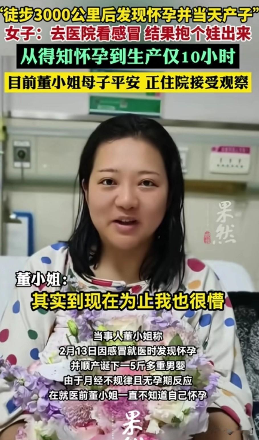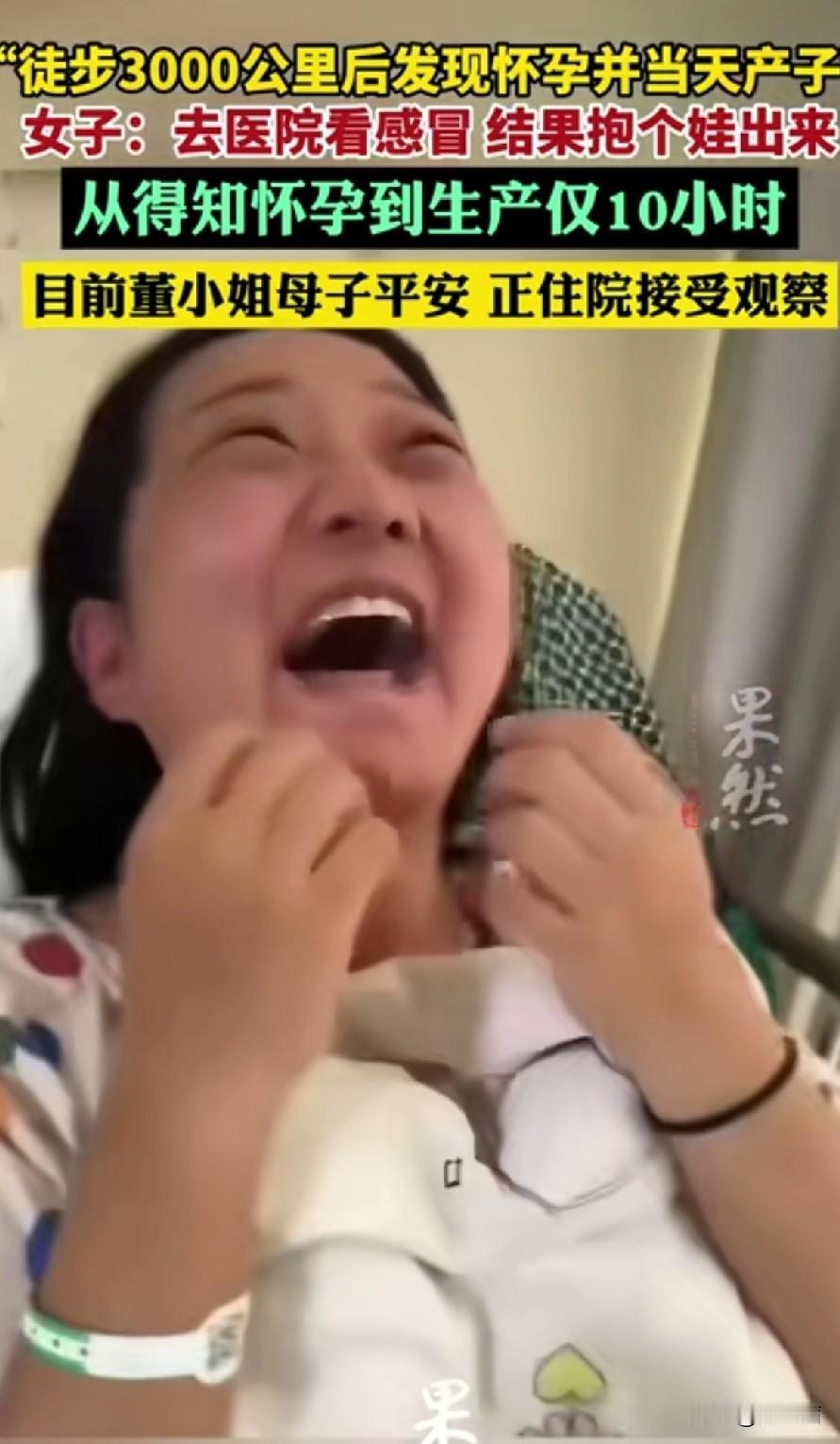 女子只是去医院看个感冒,怎么就直接生下孩子了呢? 最近,新疆一位女子的经历在网上引发了大量讨论,很多网友都觉得既神奇又不可思议。 这位董小姐是新疆“东天山来的骆驼队”的队员,她用了139天的时间,从新疆哈密徒步到河南洛阳,全程接近3000公里。在这段长时间的徒步过程里,她一直没发现自己怀孕,身体也没有出现明显的不适反应。直到2月13号那天,她因为感冒不舒服去医院检查,才知道自己马上就要生产了。 医生检查后告诉她,羊水已经破了,宫口也开了6指,当天她就顺利顺产,生下了一个5斤多重的男宝宝。董小姐说,自己本身有多囊卵巢综合征,平时月经就不太规律,加上整个孕期没有孕吐,还以为只是体重增加了,完全没往怀孕这方面想。她还提到,孕期开车时曾经被追尾,安全气囊都弹出来了,好在自己和宝宝都没事,她也说这是自己的福宝宝。 目前宝宝因为早产一个月,还在保温箱里观察,多项检查结果都显示正常。接诊的产科医生也表示,孕期进行高强度徒步,又没有做过产前筛查,其实是存在一定风险的。这件事也让很多人感慨生命的坚强,同时也提醒大家,平时要多关注自己的身体变化,有不适及时检查。