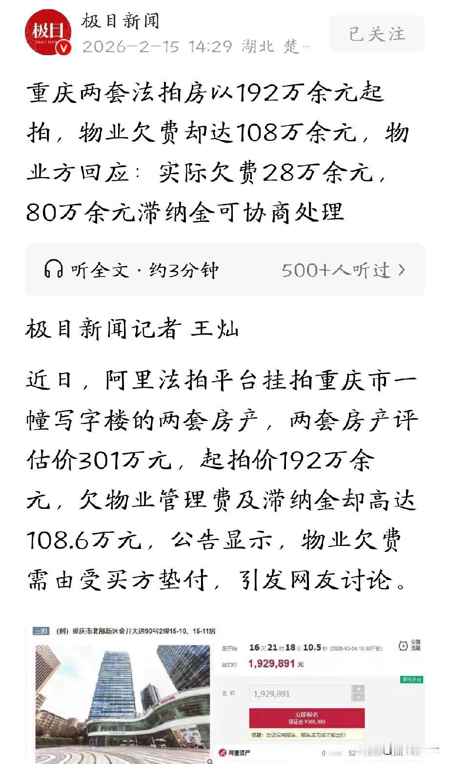太坑了!重庆,某法拍平台挂了两套房产,面积分别是150.7平方米和222.18平方米,市场估值301万元,拍价只有192万余元。大家本以为可以捡个大漏,谁知,这两套房竟然欠了108.6万的物业费和滞纳金,而且,欠费需要由买方垫付。这下,网友炸锅了,这根本不是捡漏,而是跳坑呀! 最近,某法拍平台上挂拍的两套房产引发了广泛关注和网友热议。 这两套房产位于重庆某国际中心写字楼15楼,面积分别是150.7平方米和222.18平方米。 房产的主人因为涉及刑事案件,在2022年被公安机关移送到了深圳市龙华区人民检察院审查起诉,这之后,房产就进入了法拍的流程。 2025年10月23日,法院首次将这两套房产挂拍,起拍价设定为211.8万元。 这一价格相较于房产的评估价,已有一定程度的降低,本以为能吸引不少买家,可令人意外的是,没过多久,法院就以有新的财产线索需要核实为由匆匆撤拍了。 首次挂拍受挫后,法院并未放弃,又先后两次将房产挂拍,一次按照评估价301万元,另一次降至241万元。 然而,市场似乎并不买账,两次挂拍都没有人报名,最后流拍。 这接连的流拍,让这两套房产的法拍之路更加坎坷。 到了这次,法院经过综合考量,将起拍价进一步降至192万元,并定于3月4日正式开拍。 按常理,如此低的价格应该能激起不少买家的兴趣,可截至目前,依旧无人报名。 为何会出现这种状况呢?原来,法院公告里的一个信息成了关键阻碍。 2025年7月8日,法院进行现场调查时发现,这两套房产处于打通状态,空置着无人占用。 但令人震惊的是,它们竟然暂欠物业管理费及滞纳金合计高达108.6万余元,水电费等其他欠费情况还不清楚。 而且公告还明确提醒,物业管理费及滞纳金得由买受人自行核实并承担,可能产生的法律后果也得买受人负责。 这消息让大家瞬间炸锅。大家原本买法拍房都是冲着捡漏去的,毕竟这房产评估价有301万元,现在起拍价才192万元,看似有着不小的利润空间。 可谁能想到,这看似诱人的“馅饼”背后,竟藏着高达100多万元物业费这个“大雷”。 很多人认为,法拍房本应是干干净净的,没人住,没有抵押,也没有各种纠纷,像这种欠费的情况,根本就不应该出现在法拍市场上。 况且,物业费是以前业主和物业公司之间的事儿,和买家毫无关系,不应该让买家来承担这份额外的负担。 2月15日,有记者以客户的身份咨询了物业。 物业的一名工作人员解释道,这两套房产确实已经被法院查封,目前正在法拍处理。 他们这儿的物业费是每平方米26元,两套房产的业主从2023年4月开始就没交物业费了,一共欠了28万余元。 法拍网上显示的欠物业费108.6万元,其实是物业管理费加上滞纳金的费用,另外,业主还欠了200多元的水费。 工作人员还表示,目前这两套房产都没有对外出租。如果有人拍下了,应该只需要补缴这28万余元的物业费和相关水电费。 至于那80余万元的滞纳金费用要不要缴、怎么缴,具体可以和物业协商。 《民法典》第944条:业主应当按照约定向物业服务人支付物业费。物业服务人已经按照约定和有关规定提供服务的,业主不得以未接受或者无需接受相关物业服务为由拒绝支付物业费。 案涉物业费与滞纳金本是原业主与物业公司之间的债权债务,与买受人无关。 但法院拍卖公告已明确披露欠费并约定由买受人承担,竞买人参与竞拍即视为接受该条款,在司法实践中,通常被认定为债的加入,买受人需按公告承担相应费用。 高额滞纳金并非必然全额缴纳,物业已表态可协商,买受人可依据空置事实、服务履行情况、诉讼时效等主张减免滞纳金。 即便如此,高额的物业欠费就像一堵墙,让众多潜在买家望而却步。 毕竟,谁都不想在以为捡到便宜的时候,却陷入无尽的麻烦之中。
