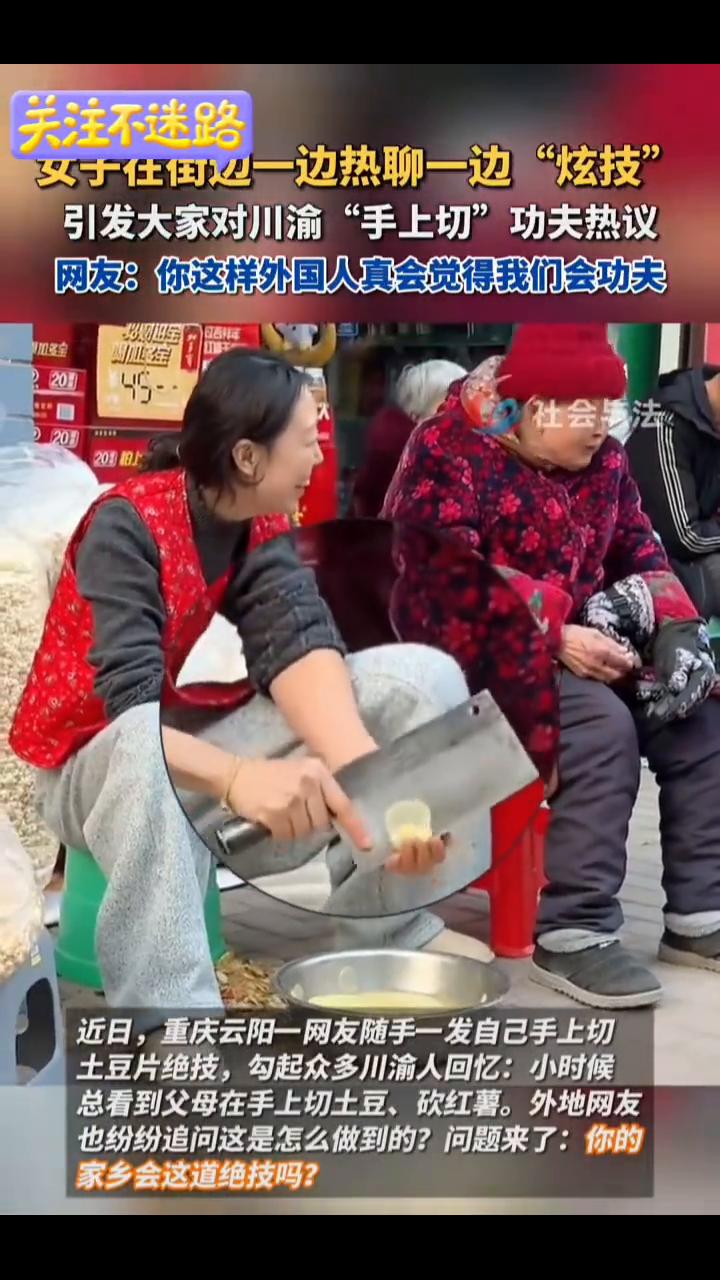 女于仕街边一边热聊一边"炫技",引发大家对川渝"手上切"功夫热议。 近日,重庆云阳一网友随手一发自己手上切土豆片绝技,勾起众多川渝人回忆:小时候总看到父母在手上切土豆、砍红薯。外地网友也纷纷追问这是怎么做到的?问题来了:你的手是怎么了?