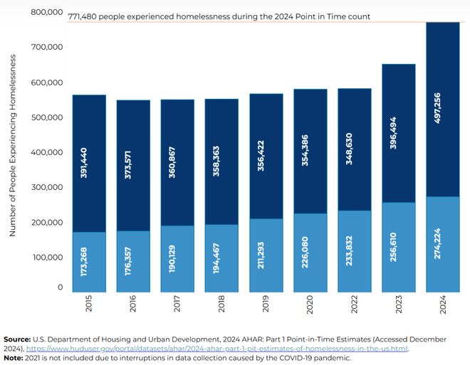 也就是说,正常来说不生孩子,死亡率还更高的流浪汉人数应该越来越少才对,但与之相反,2024年美国流浪汉人数居然比2015年增长了36.6%,多出了20多万人。