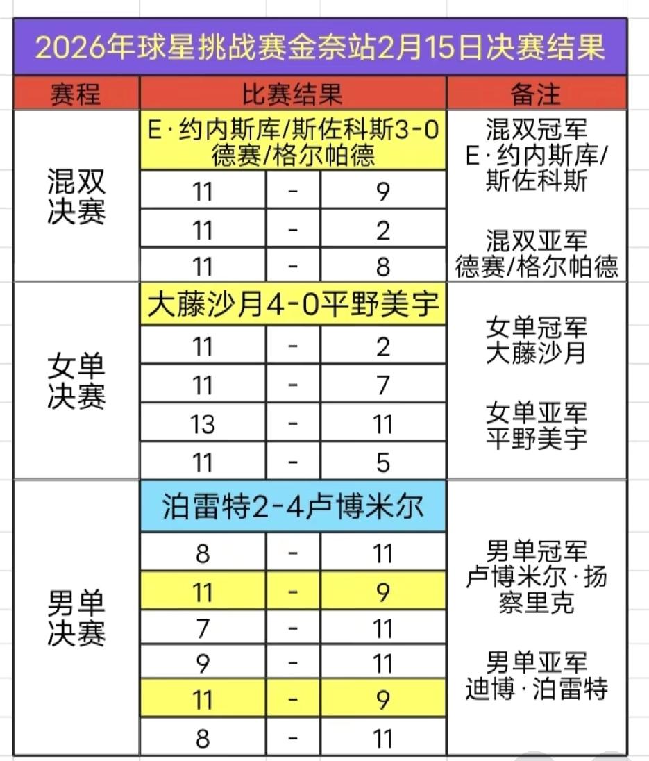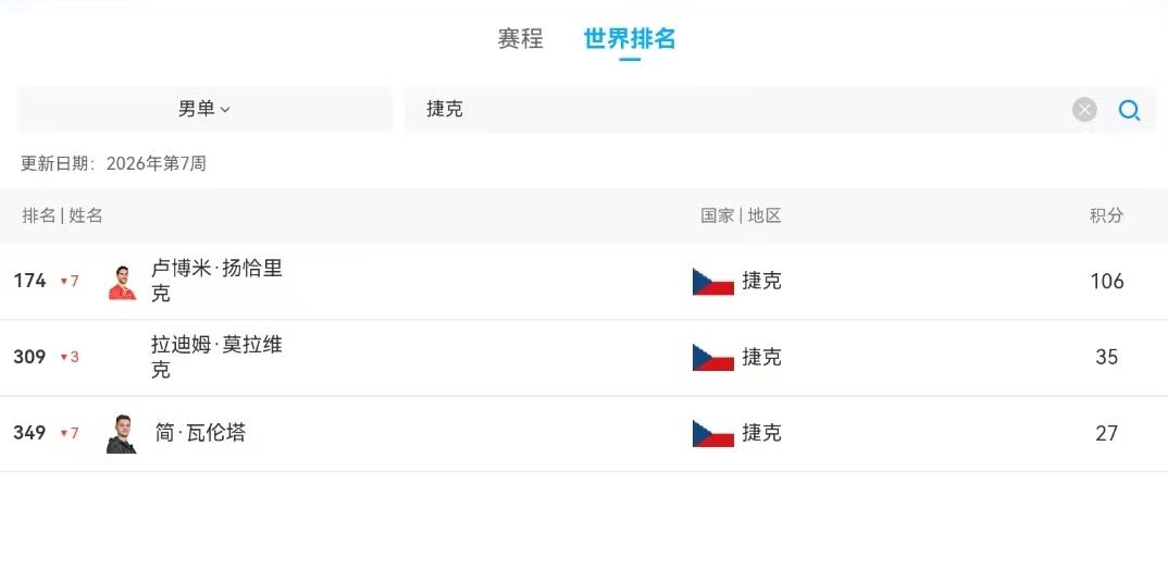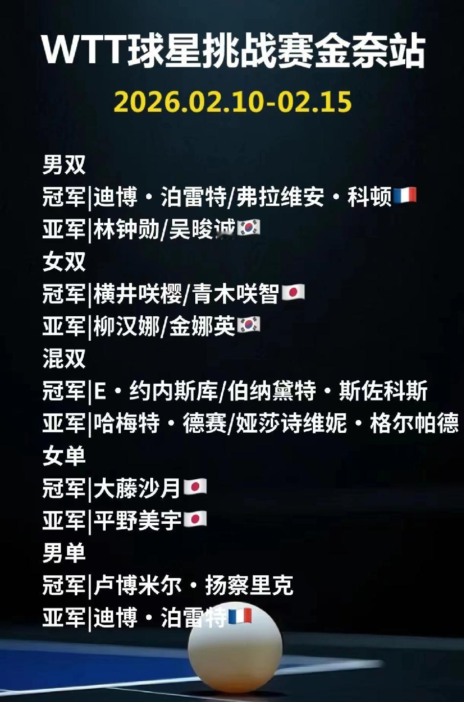 金奈球星挑战赛,资格赛突围的扬察里克斩将夺魁一战成名,世界排名创纪录地飙升140位 2月15日,WTT金奈球星挑战赛最后一战,男单决赛扬查里克4:2泊雷特,捷克38岁老将扬查理克夺冠。 捷克选手卢博米尔·扬查里克,38岁,世界排名174位。本站老将扬查里克从资格赛打起,先是资格赛突围,又一路过关斩将闯进决赛,决赛中,捷克老将与法国小将泊雷特大战6局,4:2胜出,夺冠捧杯。 扬察里克的原本积分106分,现在加上600积分,700多分会让扬察里克创记录地飙升140位到30几名。 其它几项冠军参看下图。
