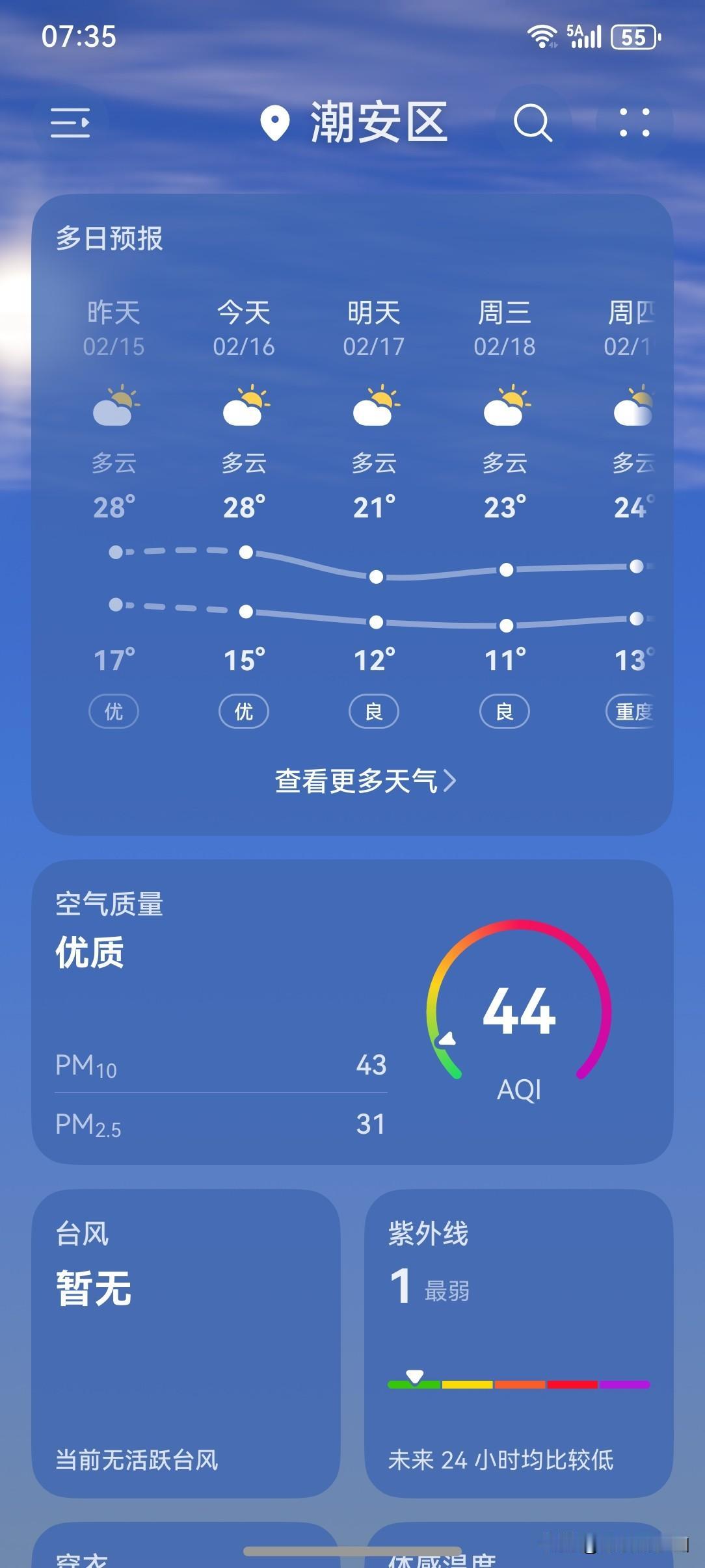 广东:除夕冷空气赶来过大年!率先影响粤北地区! 除夕(16日)白天,新一股中等强度冷空气前锋率先影响粤北地区,夜间影响中南部市县;初一至初二(17~18日)我省分散小雨转多云;16~18日过程降温幅度:粤北下降6~8℃,其余市县下降3~5℃;18日早晨粤北高海拔山区最低气温3~6℃。 今天(16日),潮州喜提一个多云天气,气温15~28℃,此刻气温18℃,体感温度17℃。 今天的全天最高气温依然是28℃,又来体验一下夏天的快乐啦! 一起来看看今天的天空吧!今天的云量明显没有昨天那么多了,一大早太阳就已经上线营业啦!蛇年的最后一天,阳光要开始拼业绩呢! 天气晴朗,阳光甚好,气温有点高……这样的天气,依然值得拥有一个五星好评! 如此天气!元芳,你怎么看? [捂脸][大笑][笑哭][我想静静][捂脸][大笑][笑哭][我想静静][捂脸]