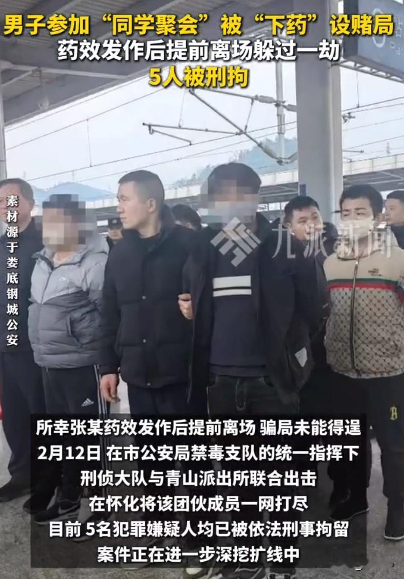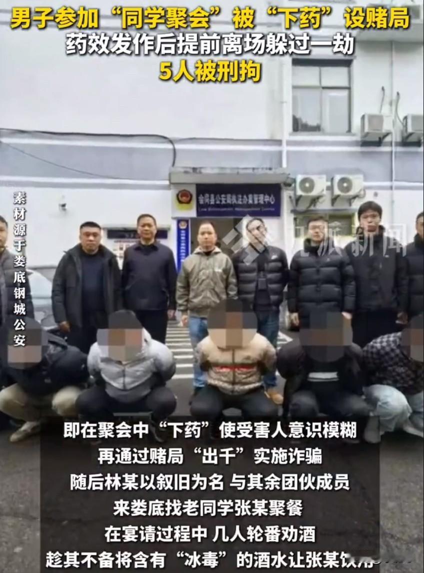 湖南娄底一名男子在参加同学聚会时,遭遇了一场精心设计的骗局,原本以为是老朋友叙旧,没想到对方是冲着设局骗钱来的,好在男子反应及时,提前离场才躲过一劫,事后警方介入调查,将这个害人的团伙一网打尽。事情起因是一名叫张某的男子,接到了老同学林某的邀约,对方说要组织一场聚会,大家好久不见,一起吃吃饭聊聊天,张某没有多想就答应赴约,他以为这只是一场普通的同学重逢,却不知道自己已经成了别人盯上的目标。林某并不是真心想叙旧,而是和另外几人早就商量好,要通过组局杀猪的方式牟利,所谓的杀猪盘,就是先把人骗到局里,再用不正当手段榨取钱财,他们把目标锁定在老同学身上,就是看准了熟人之间更容易放下戒备。几人提前做好了分工,由林某出面邀请,其他人配合演戏,专程从外地赶到娄底,把这场鸿门宴摆到了张某面前。聚餐过程中,几人轮番向张某劝酒,场面看起来十分热闹,气氛也很融洽,就在张某放松警惕的时候,有人趁他不注意,把掺了违禁成分的酒水递到他面前,诱导他喝了下去。没过多久,张某就感觉身体不对劲,平时酒量还可以的他,突然觉得头晕眼花,整个人神志不清,意识越来越模糊,这种强烈的不适感让他立刻警觉起来,他意识到这场聚会有问题,自己很可能被人下了东西。尽管身体很难受,张某还是强撑着最后一点清醒,不顾身边人的挽留,坚持说身体不适要提前离开,正是这个果断的决定,让他逃过了后面的圈套。这伙人的原本计划,是等张某意识模糊、失去判断力之后,拉着他去赌博,再在牌桌上出千作弊,轻轻松松骗走他的钱,可张某提前走了,他们的骗局还没开始就落空了。离开现场之后,张某越想越害怕,也越想越不对劲,他确定自己不是简单喝醉,而是被人暗算了,于是立刻报警,把自己的遭遇和怀疑都告诉了民警。警方接到报警后非常重视,立刻展开侦查,一方面调取了聚会地点以及周边的监控录像,逐一排查细节,另一方面对张某进行血液检测,结果显示,他体内确实含有违禁毒品成分,坐实了被下药的事实。民警顺着线索继续深挖,梳理在场人员的活动轨迹和人际关系,很快锁定了以林某、黄某为首的五名嫌疑人,摸清了这个团伙的作案脉络和藏身地点。在掌握充分证据之后,警方统一行动,一举将这五名犯罪嫌疑人全部抓获,到案之后,他们对自己下药设赌局、意图诈骗的行为供认不讳。目前,五人都已被依法刑事拘留,案件还在进一步办理中。一场打着同学情旗号的聚会,变成了让人后怕的陷阱,也给所有人提了个醒,面对突然热情的邀约,尤其是长时间不联系的熟人组局,一定要多留个心眼,在外就餐喝酒时,看好自己的水杯酒杯,不喝来路不明的酒水,感觉身体不适立刻离开并寻求帮助,保护好自己的人身和财产安全。 来源:九派新闻