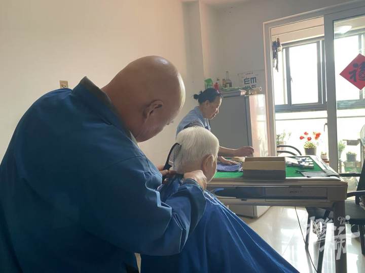 老人理发的频率通常是一个半月一次。但俞师傅从不死板。老人想修修鬓角,他上门;老人身体不舒服出不了门,他上门;老人只是单纯想找人聊聊天,他也上门,有时剪完头发还坐下喝杯茶。
