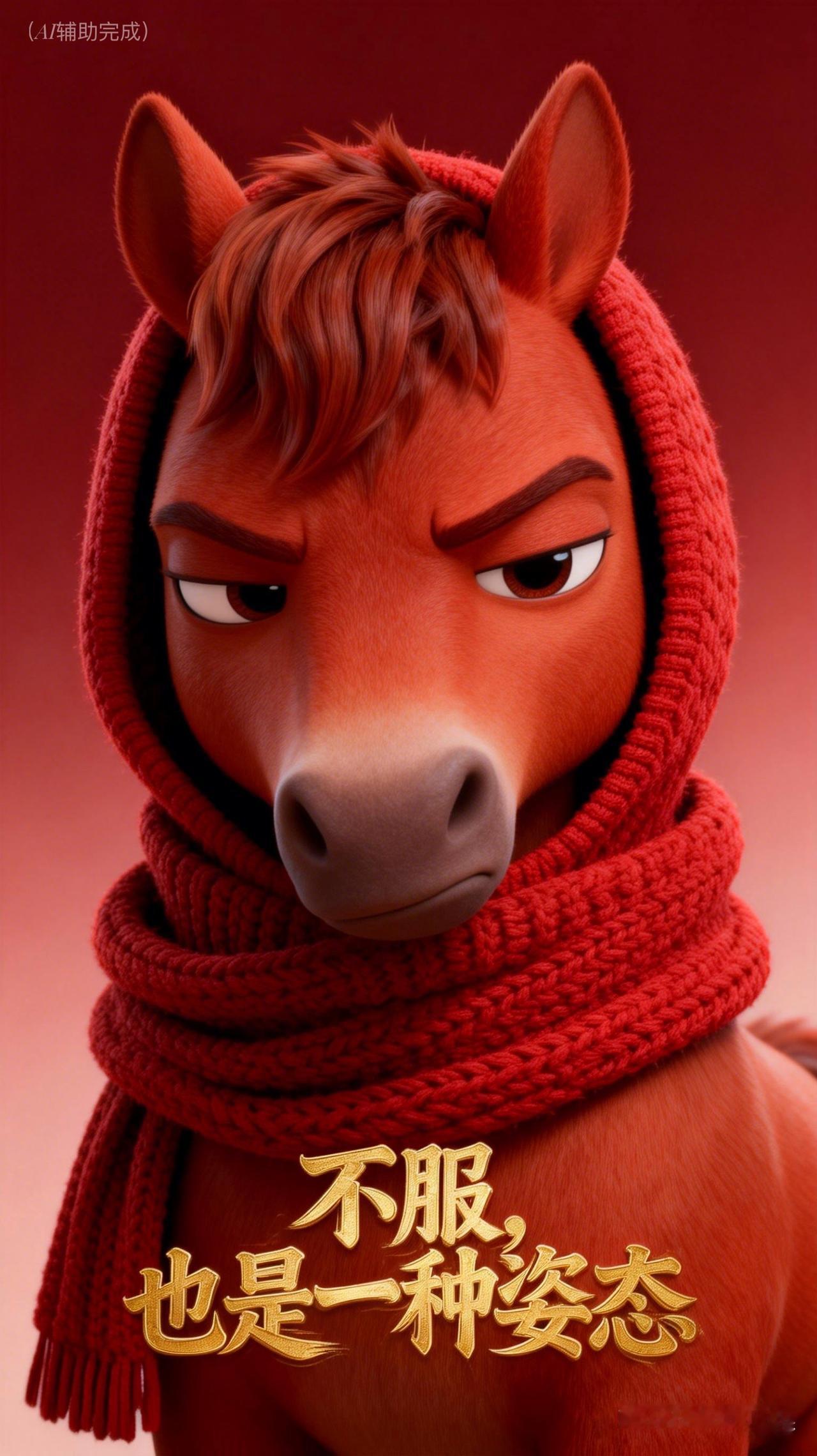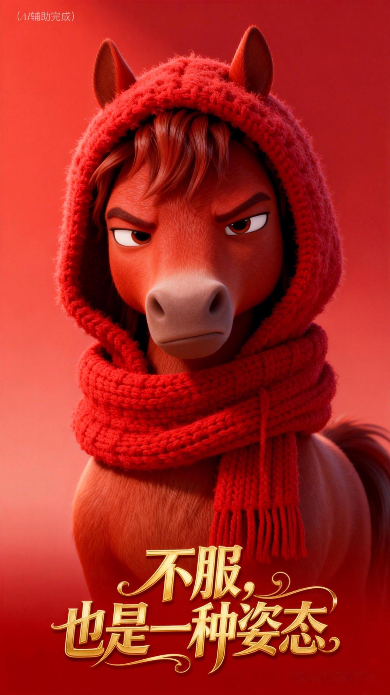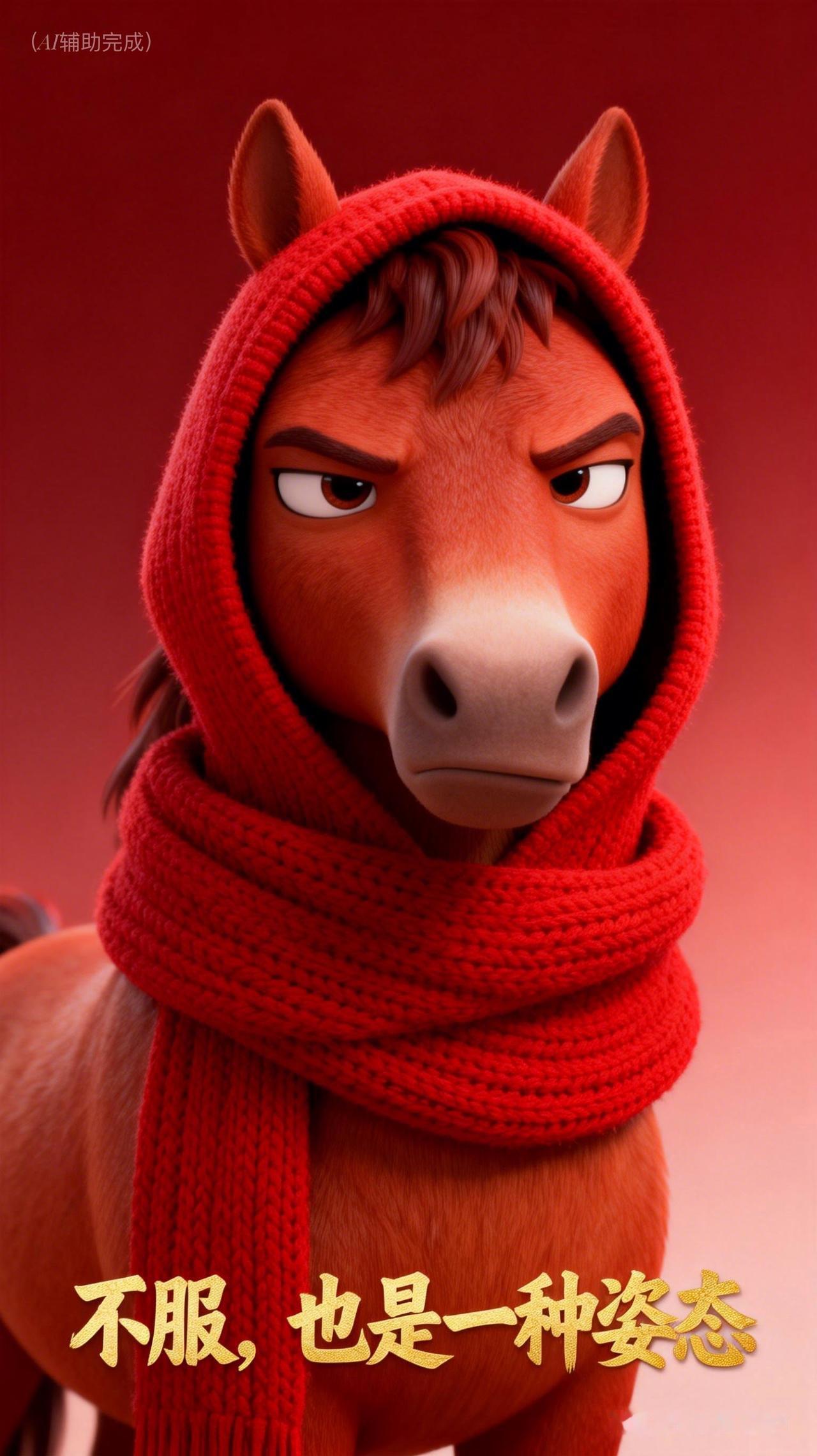红鬃似火燃倔强,连帽围巾添暖光。眼神如炬藏锋芒,双耳竖立显不羁,眉峰微挑透傲骨。红底渐变衬英气,这帧“不服”红马,以烈焰之姿写就坚韧诗行,一眼沦陷!