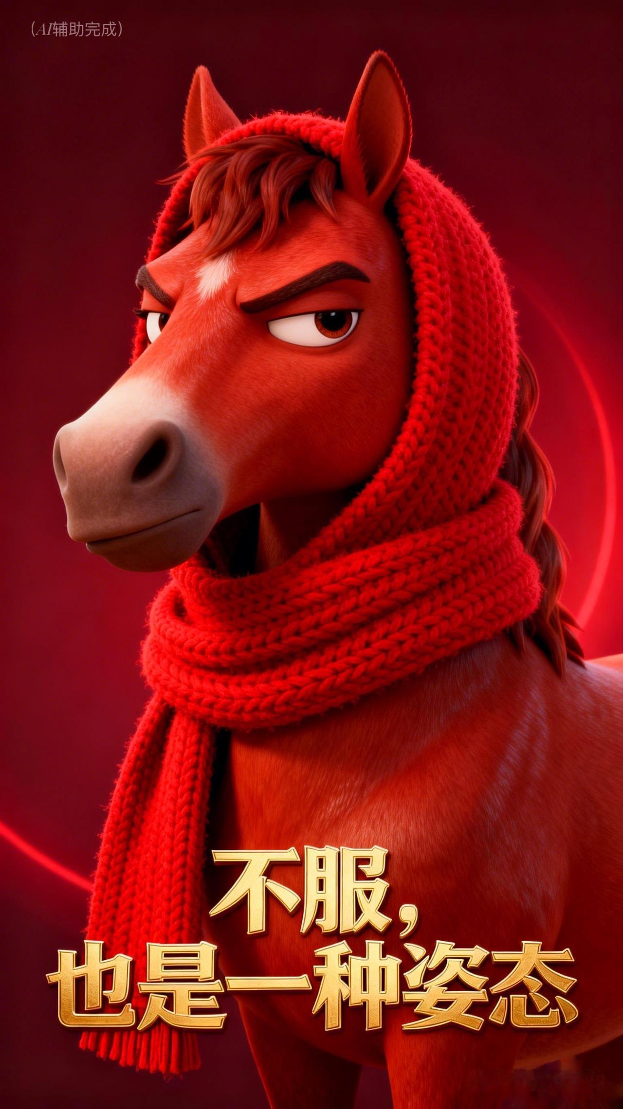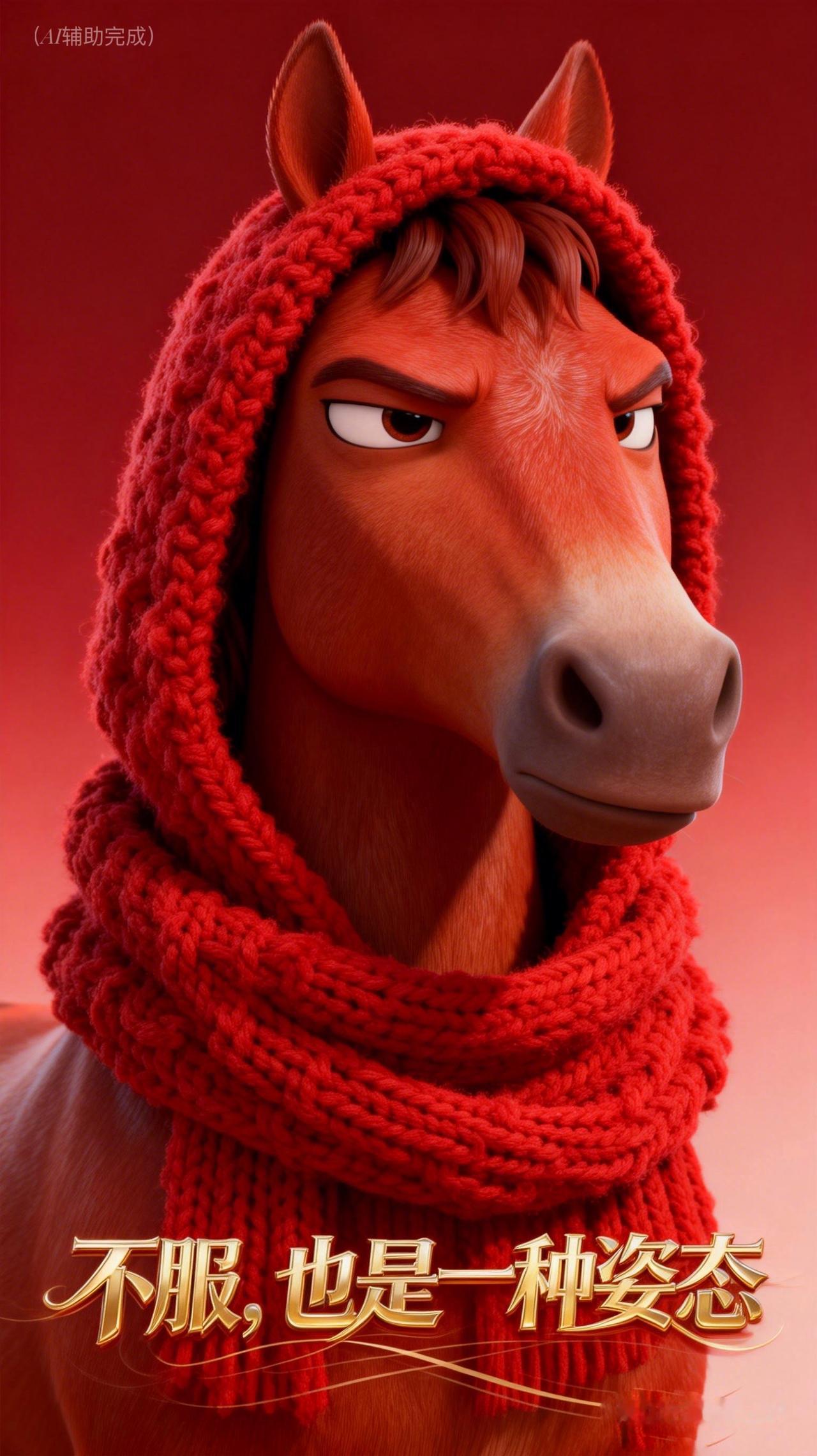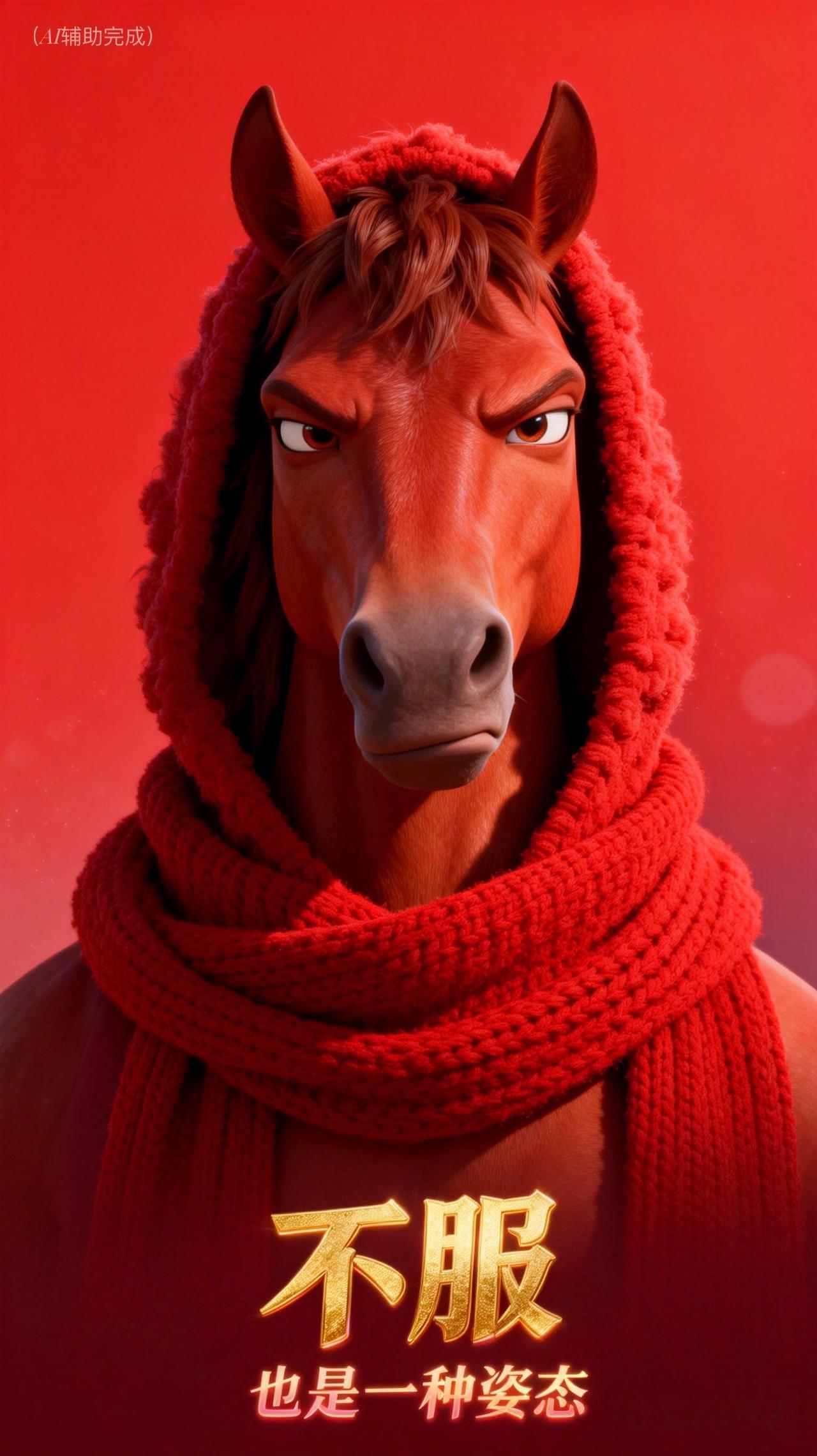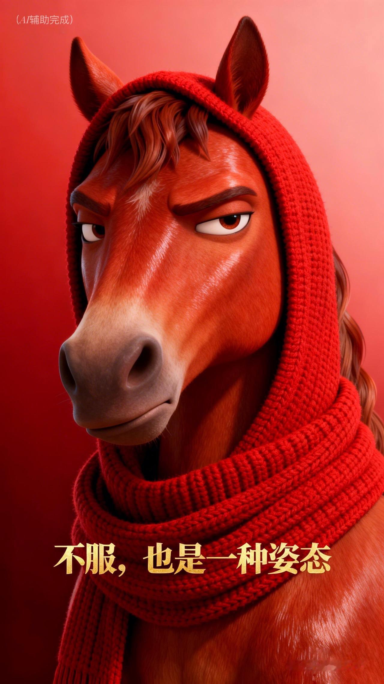 红鬃似火燃倔强,连帽围巾添暖光。眼神如炬藏锋芒,双耳竖立显不羁,眉峰微挑透傲骨。红底渐变衬英气,这帧“不服”红马,以烈焰之姿写就坚韧诗行,一眼沦陷!