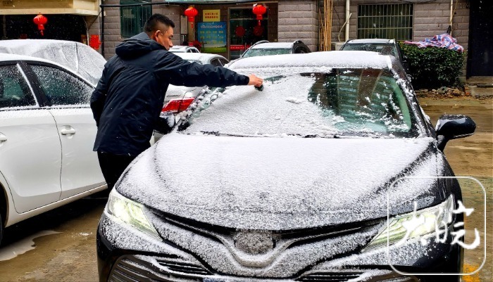 大皖新闻讯2月16日(农历除夕)上午8时许,淮南市龙湖汇景小区内,一名男子正细心清理车窗上的积雪,为新春出行做准备。