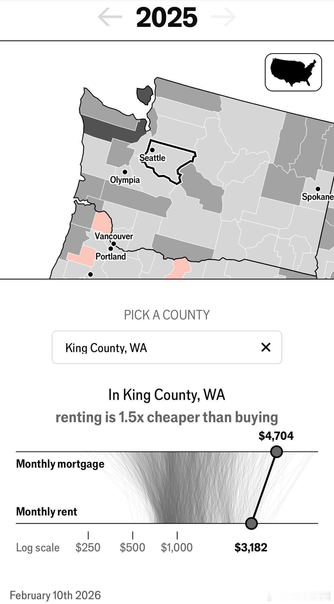 租房更便宜的地区(图一 黑色)在西部,例如西雅图所在的郡(图二):月租金平均$3200,房贷月付平均$4700