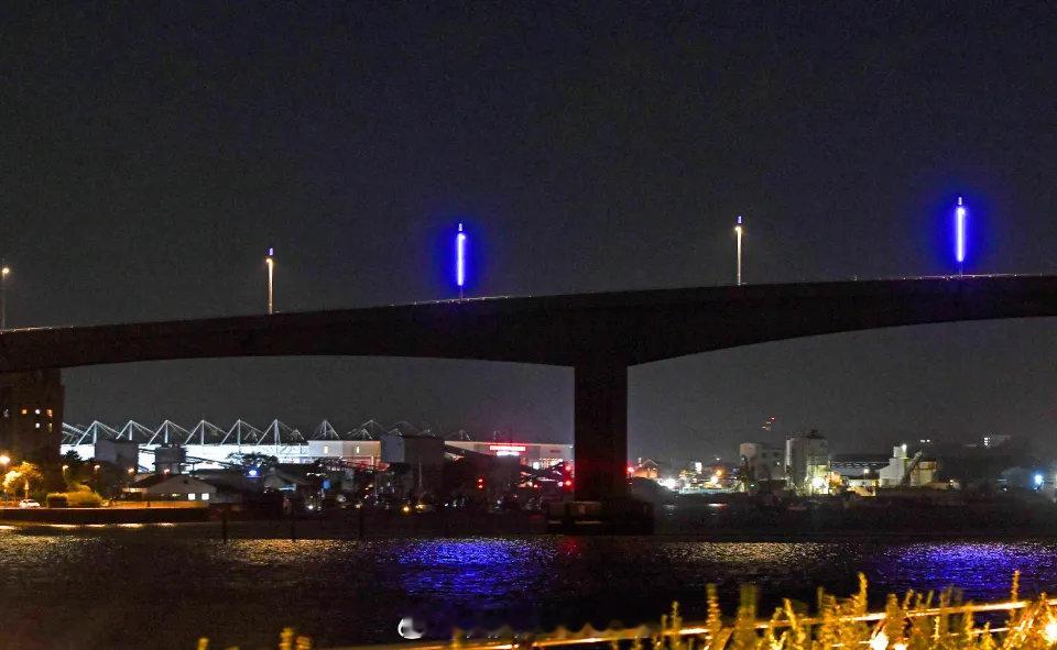 【死敌的颜色】英冠球队南安普顿,距离他们的主场圣玛莉球场半英里外,有一座大桥,每逢晚上,桥上都亮起蓝色的灯柱,站圣玛莉球场都能看到这一幕。