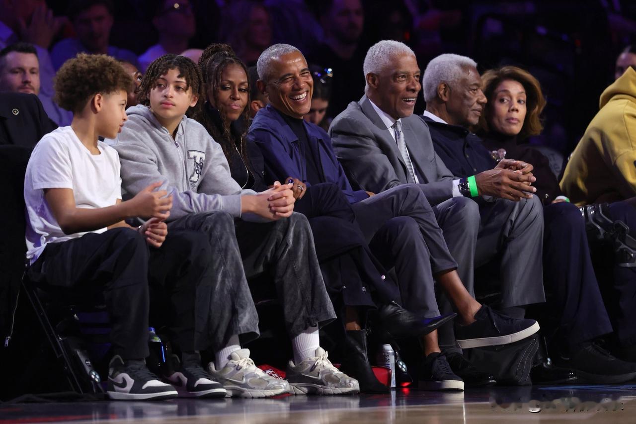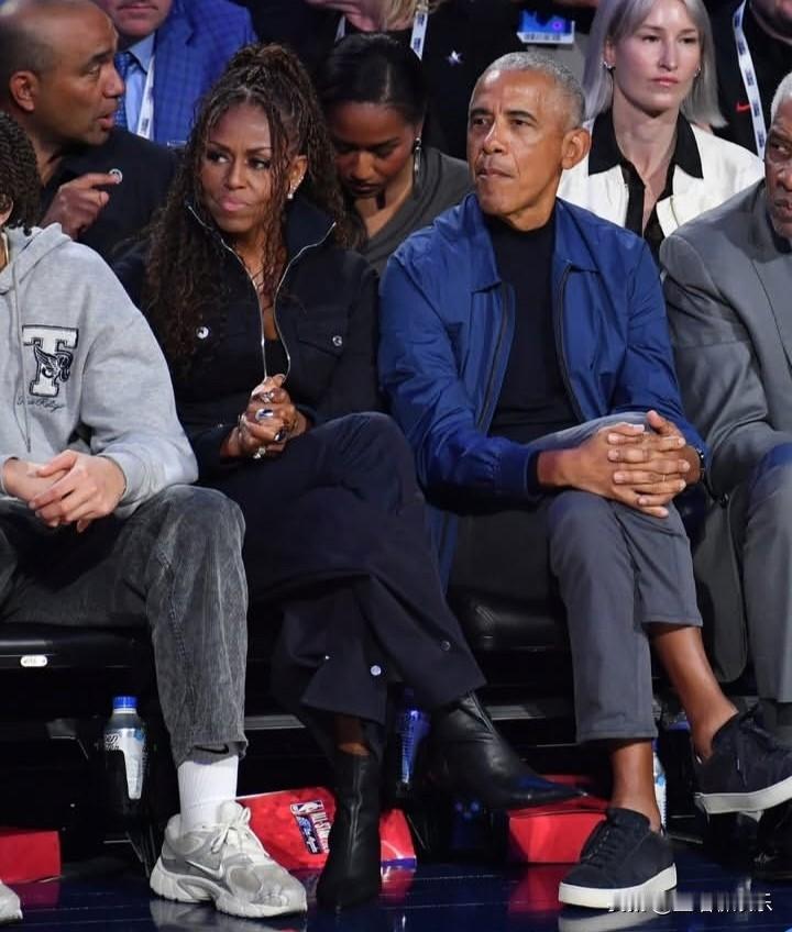 奥巴马夫妇罕见出现在今天的NBA全明星赛上。 美前总统还在X上发了合照(图1)并写道:“场上场下我最喜欢的队友。” 62岁的米歇尔穿着黑色紧身夹克搭配高尾脏脏辫妆造显年轻,她把手放在丈夫的腿上,奥巴马笑逐颜开。