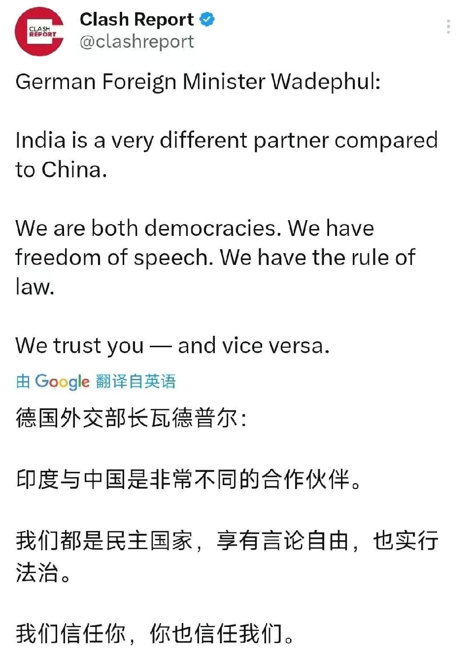昨天,德国外长瓦德富尔与印度外长苏杰生会晤时表示:“印度与中国是非常不同的合作伙伴。我们都是民主国家,享有言论自由,也实行法治。我们信任你们,你们也信任我们。” 德印外长会晤时强调双方理念相近,折射出欧洲在印太地区的战略布局思路。当下全球产业链重构、国际格局深刻调整,欧盟一边希望稳定对华经贸关系,一边试图通过强化与印度合作实现多元化布局。历史上欧洲曾长期以价值观划分合作阵营,但现实是,经贸往来与市场稳定才是合作根基。中国与欧洲互补性极强,双边贸易额长期保持高位。各国发展道路不同,合作不应被单一标准绑架。理性看待差异、聚焦务实共赢,才是中欧、中欧美印多方关系的长久之道。