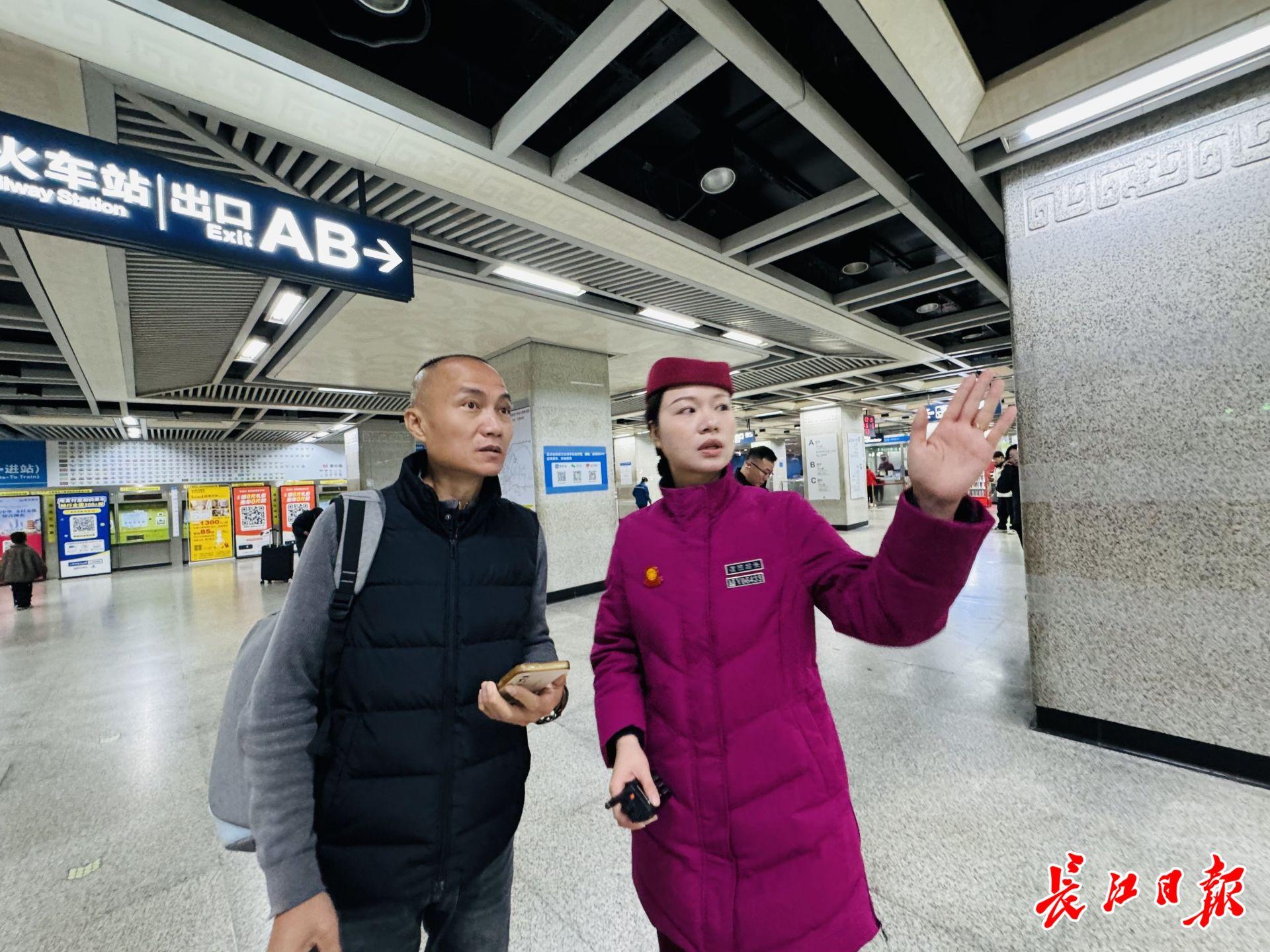 上午11时,随着国铁又一波到站客流高峰的到来,大批旅客陆续涌入地铁站。“我要去汉口站,该坐哪条线路?”“请问怎么去江汉路?”“我们行李太多,垂直电梯在哪里?”面对旅客们的各种询问,陈娜在站厅里一遍遍耐心地解答,从乘车方向到换乘节点,细致又暖心。