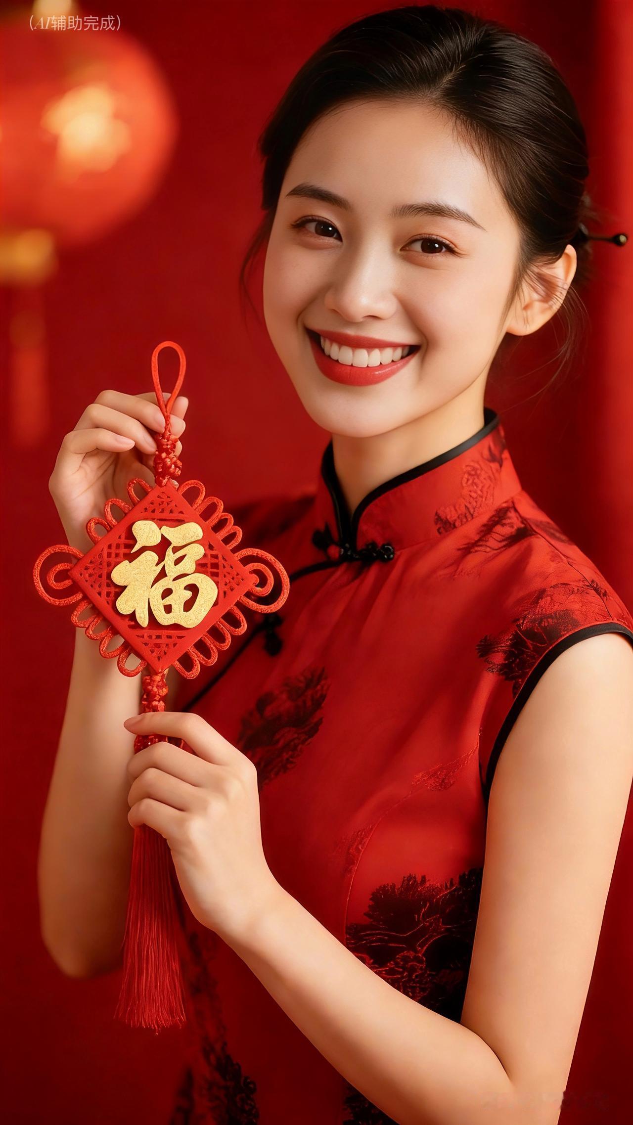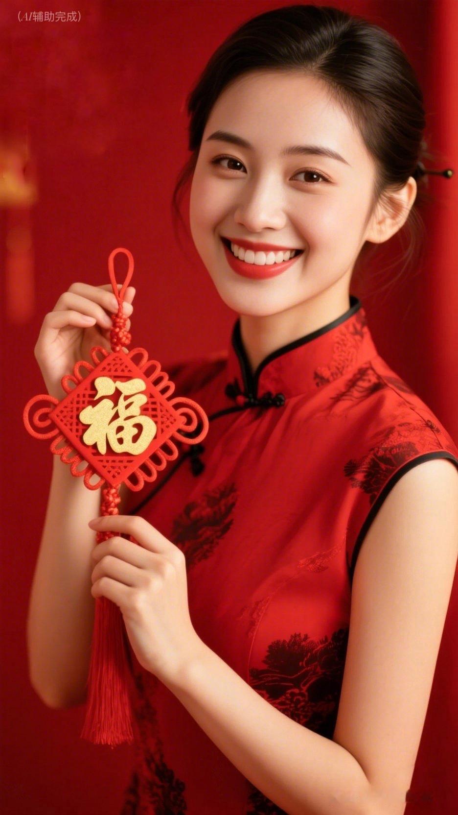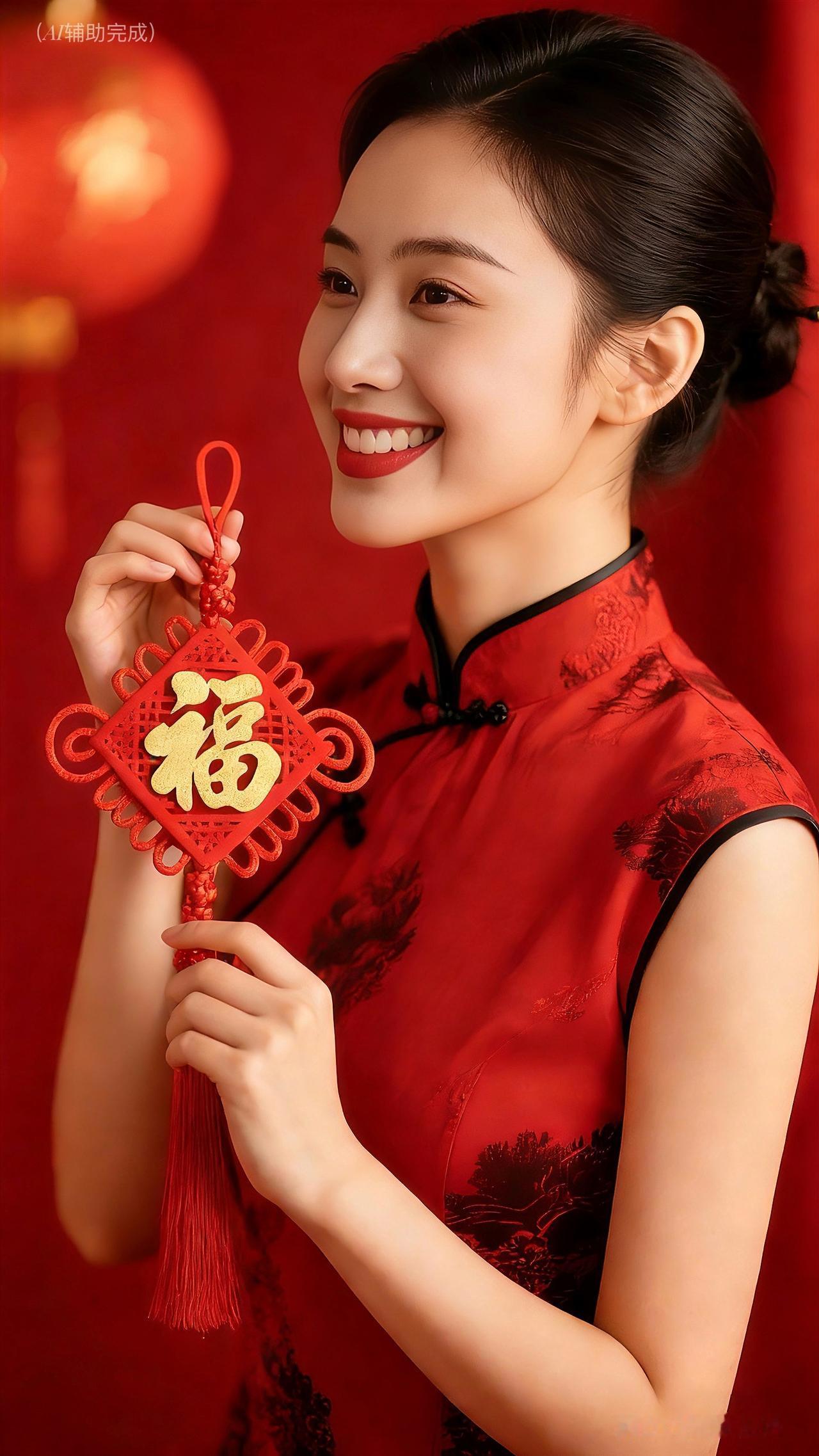 红底黑纹旗袍裹雅姿,盘发高挽显典雅。双手捧福字中国结,眉眼含笑眸漾春,红唇甜绽。