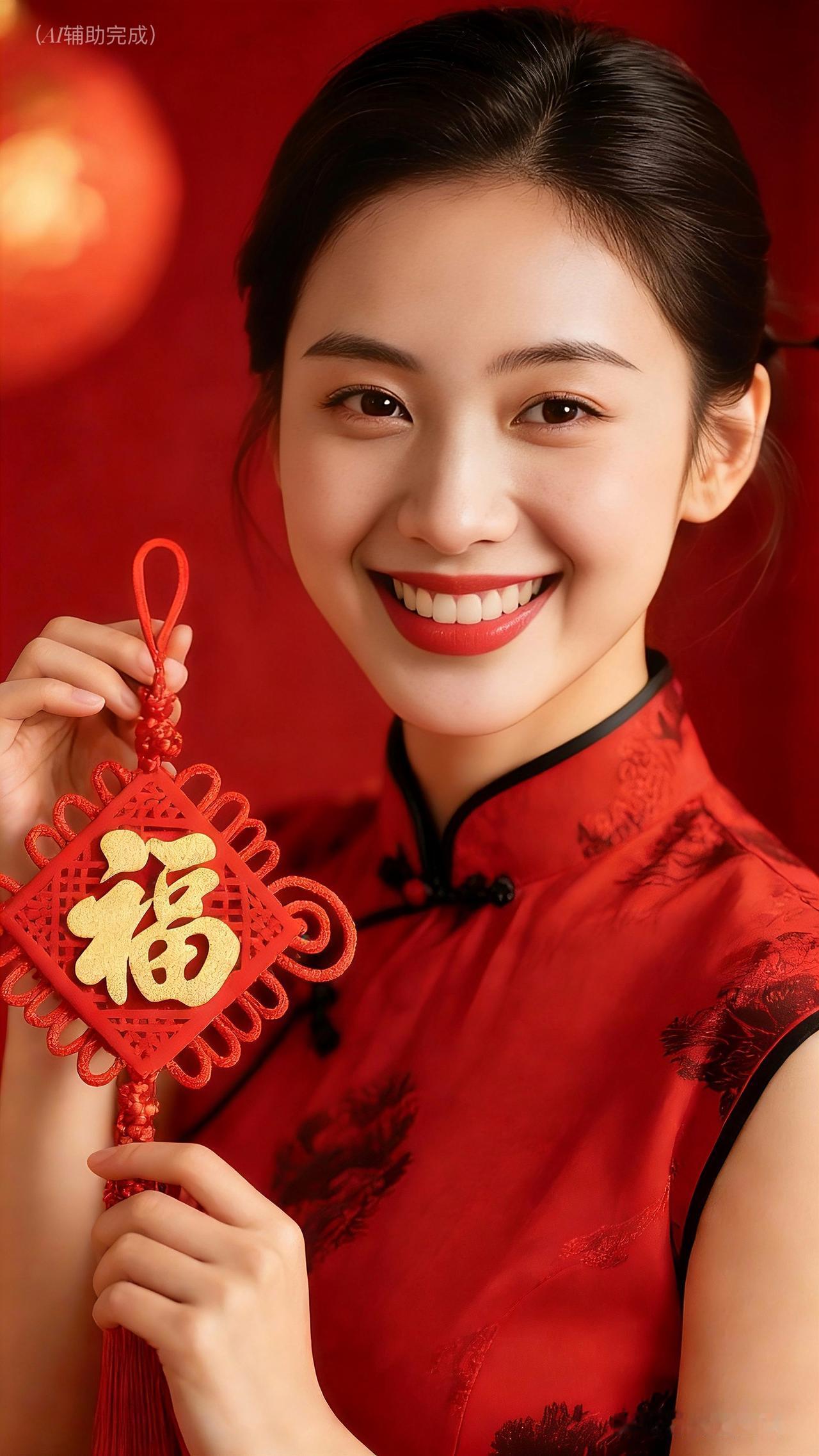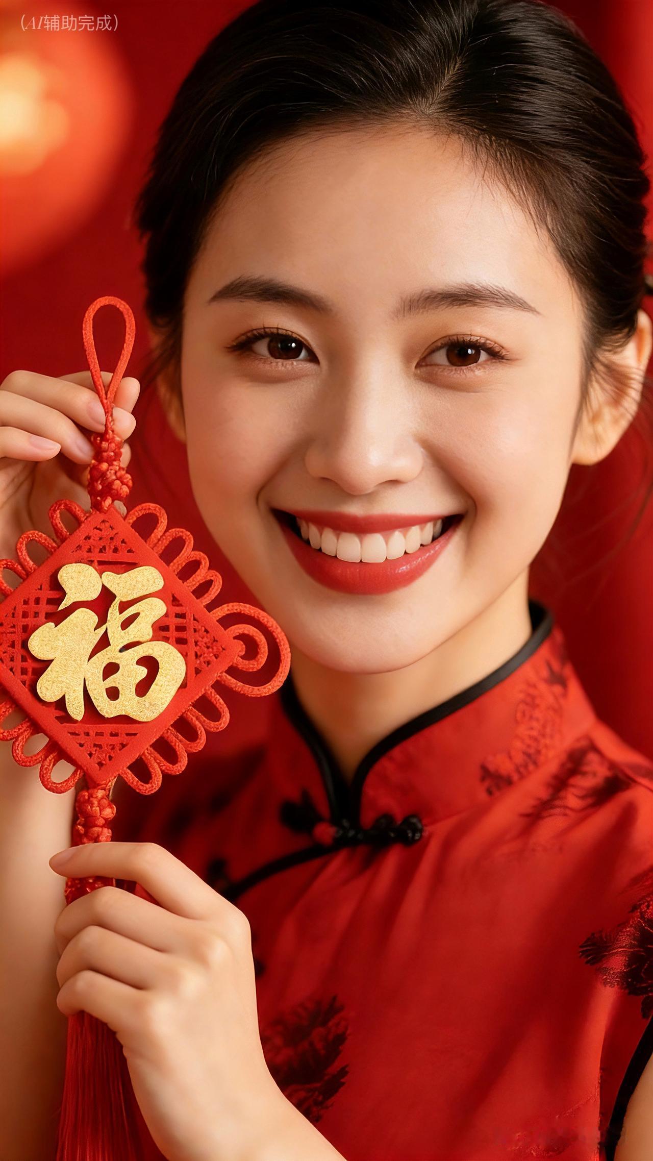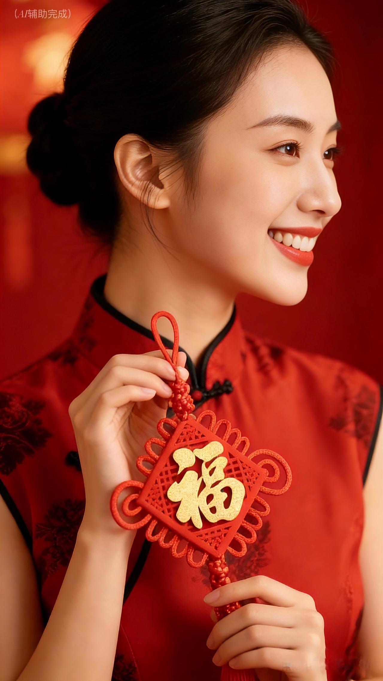 红底黑纹旗袍裹雅姿,盘发高挽显典雅。双手捧福字中国结,眉眼含笑眸漾春,红唇甜绽。