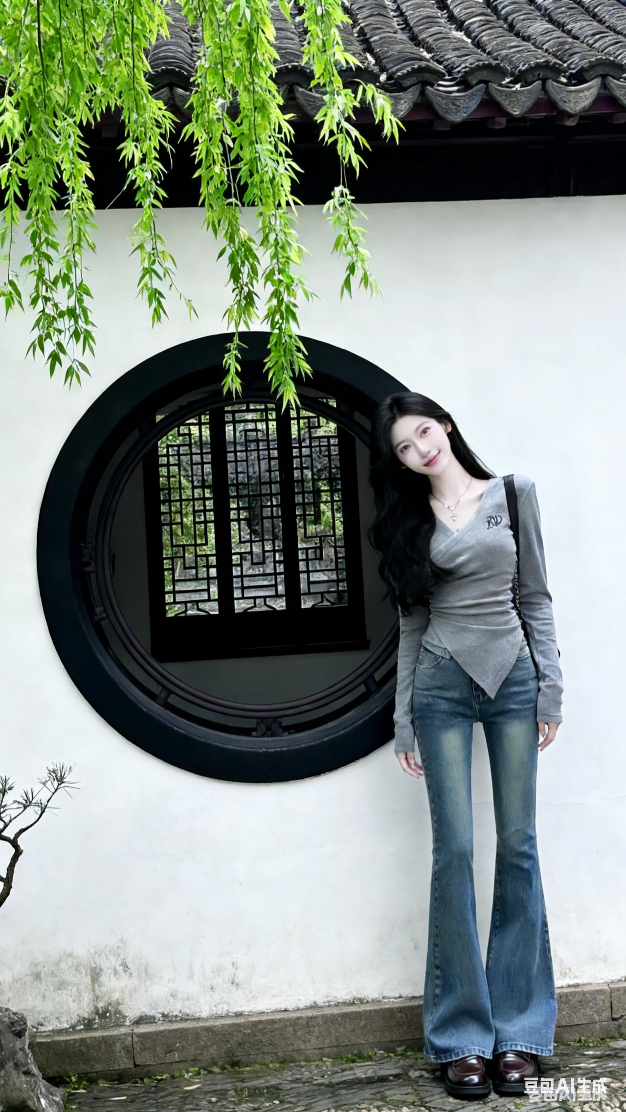 在古风建筑前,少女俏皮比V,复古牛仔裤与现代时尚完美融合。