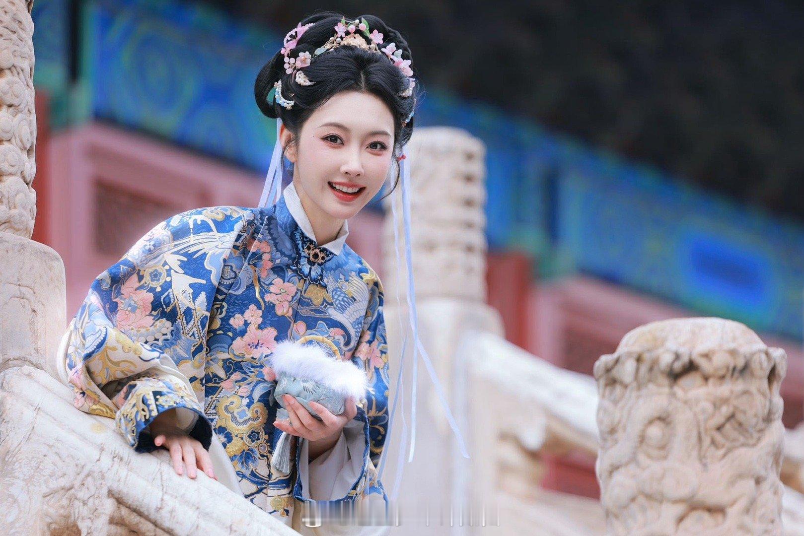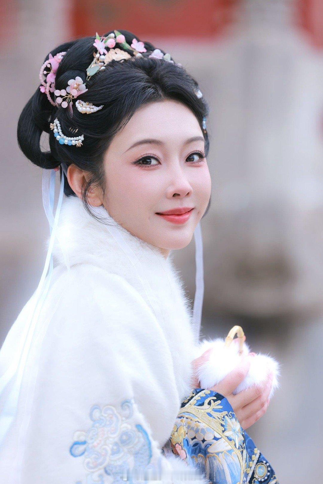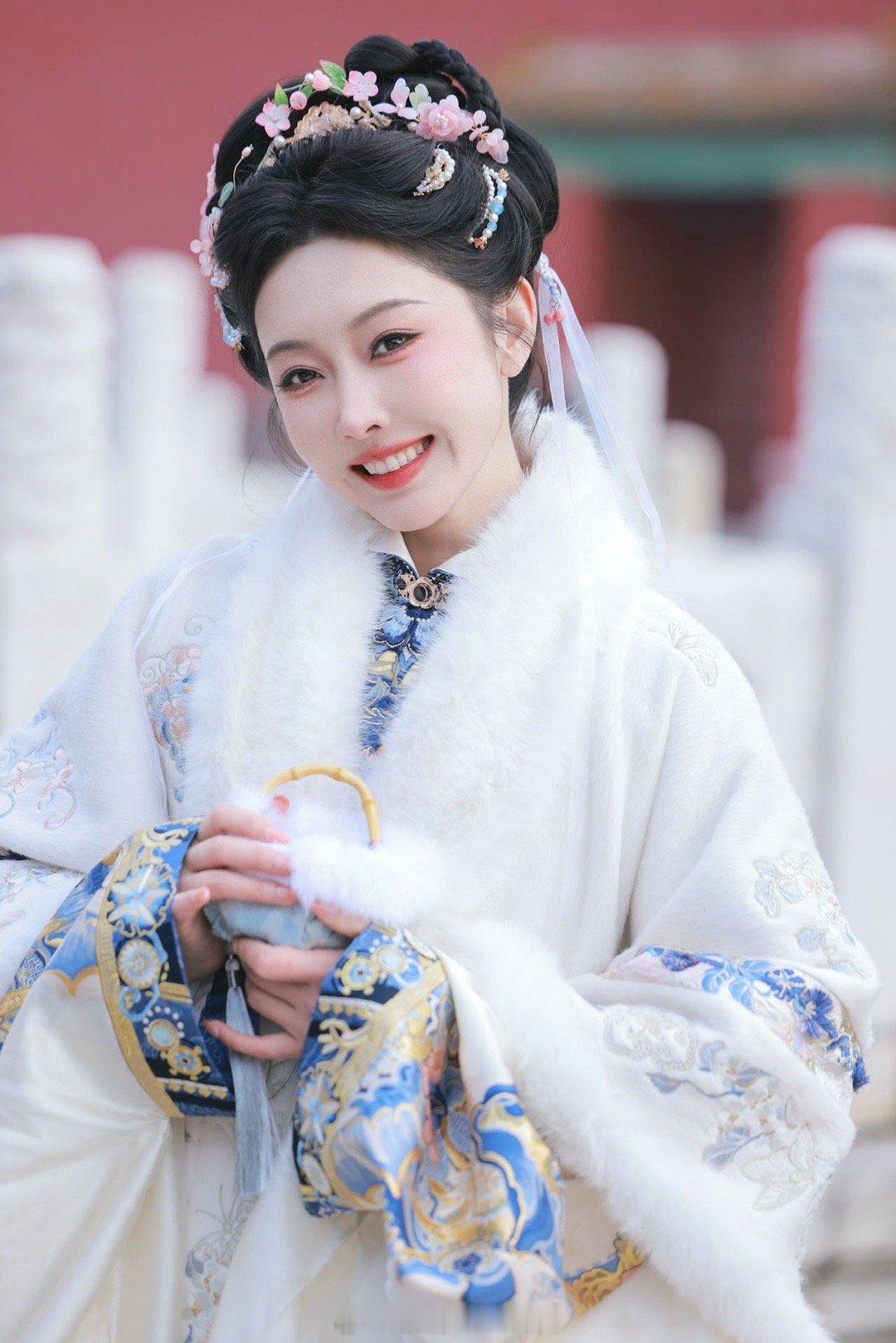 宣璐明制汉服美成啥了 谁说明制汉服不好驾驭?宣璐这一身素白披风配蓝金绣纹,毛领衬得气质温润如玉。红墙前那么一站,端庄大气全出来了。干净舒服,这才是该被看到的东方美!