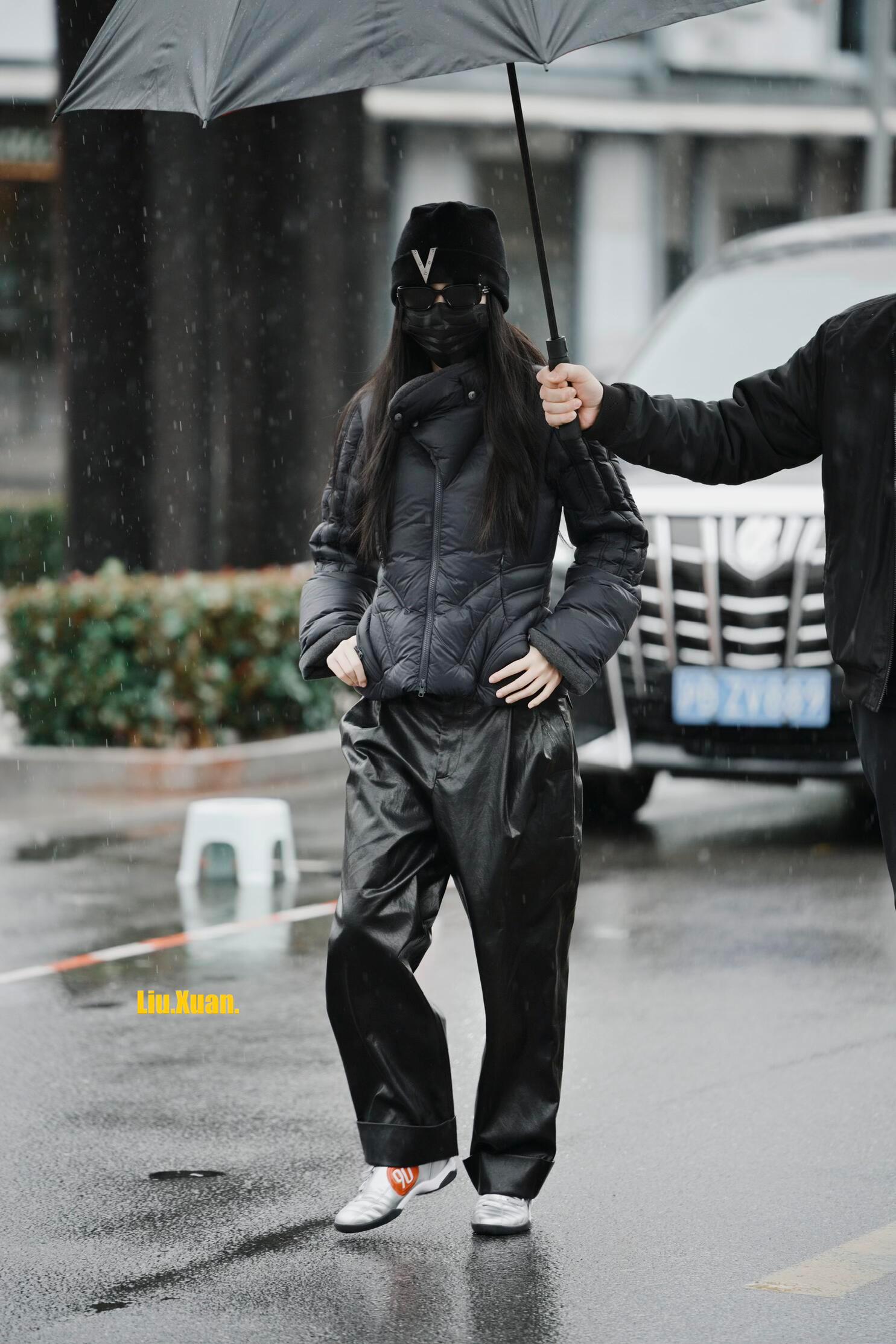 虞书欣《云初令》上班路透,短款黑色羽绒服+黑色皮裤,搭配带金属V字装饰的冷帽和墨