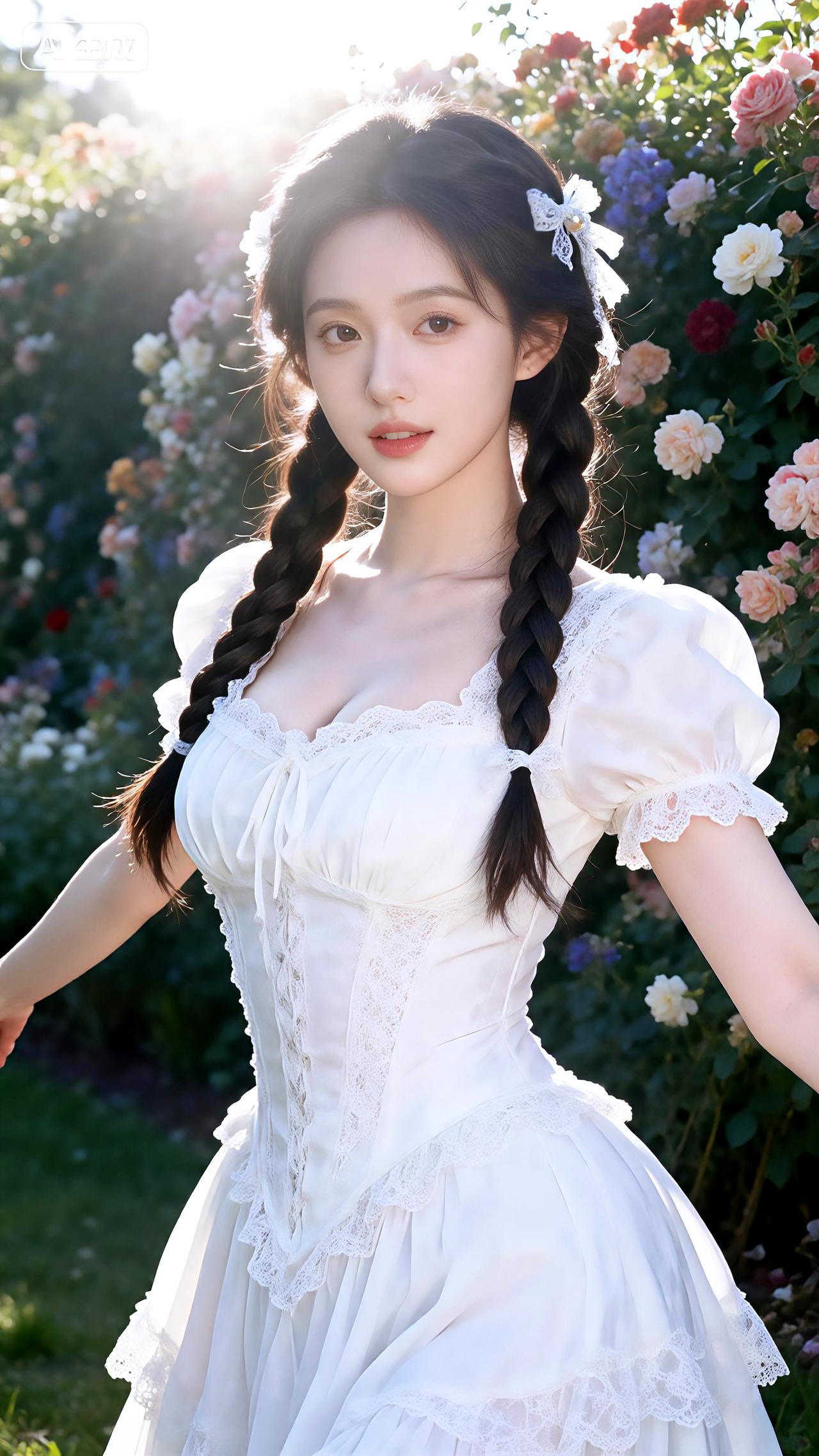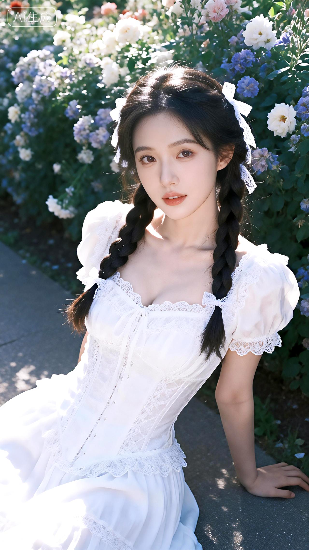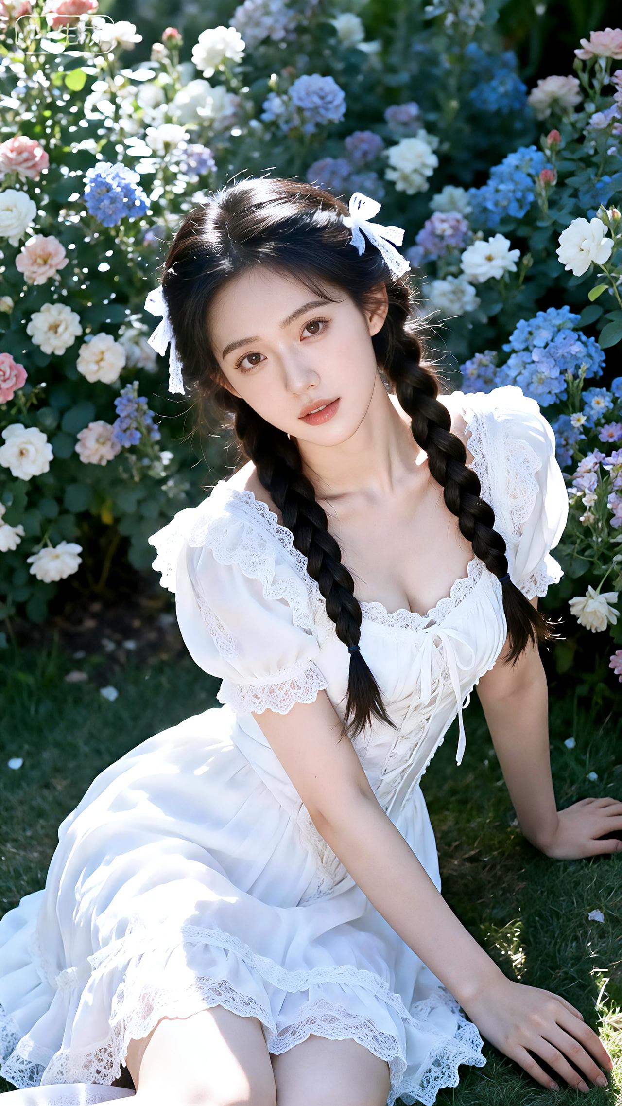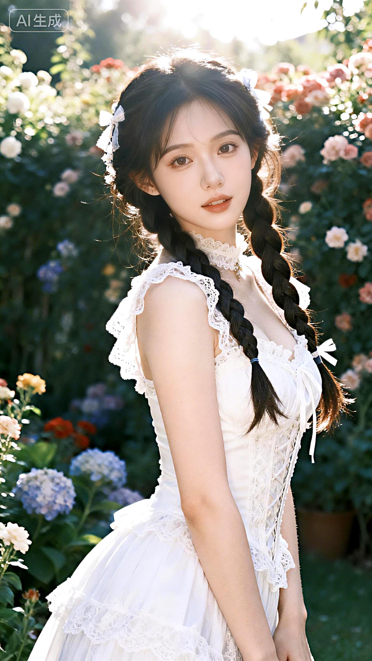 新年生活图鉴繁花簇拥的花墙前,她编着麻花辫身着蕾丝白裙,宛若林中走出的仙子。豆包 壁纸 写真