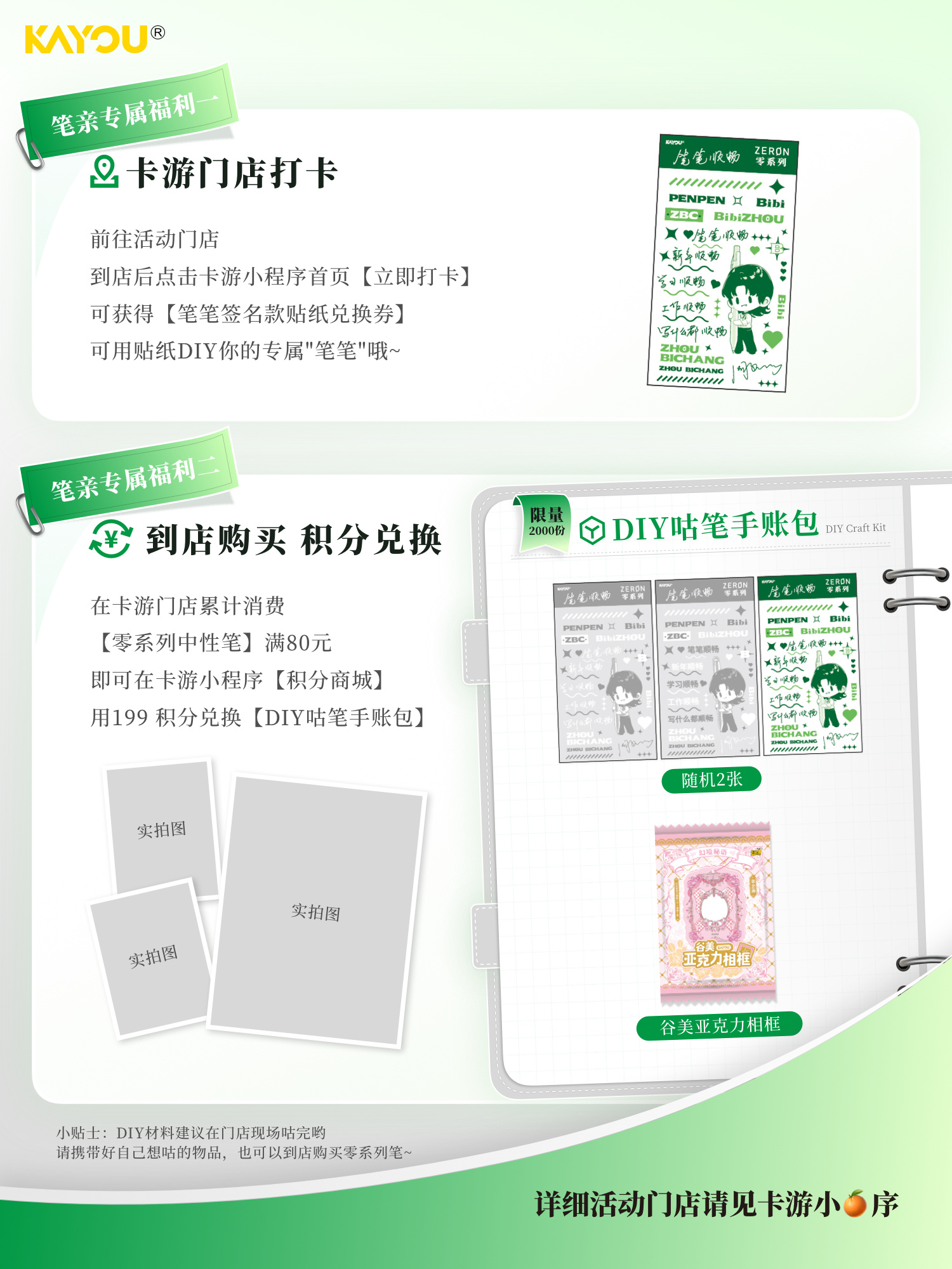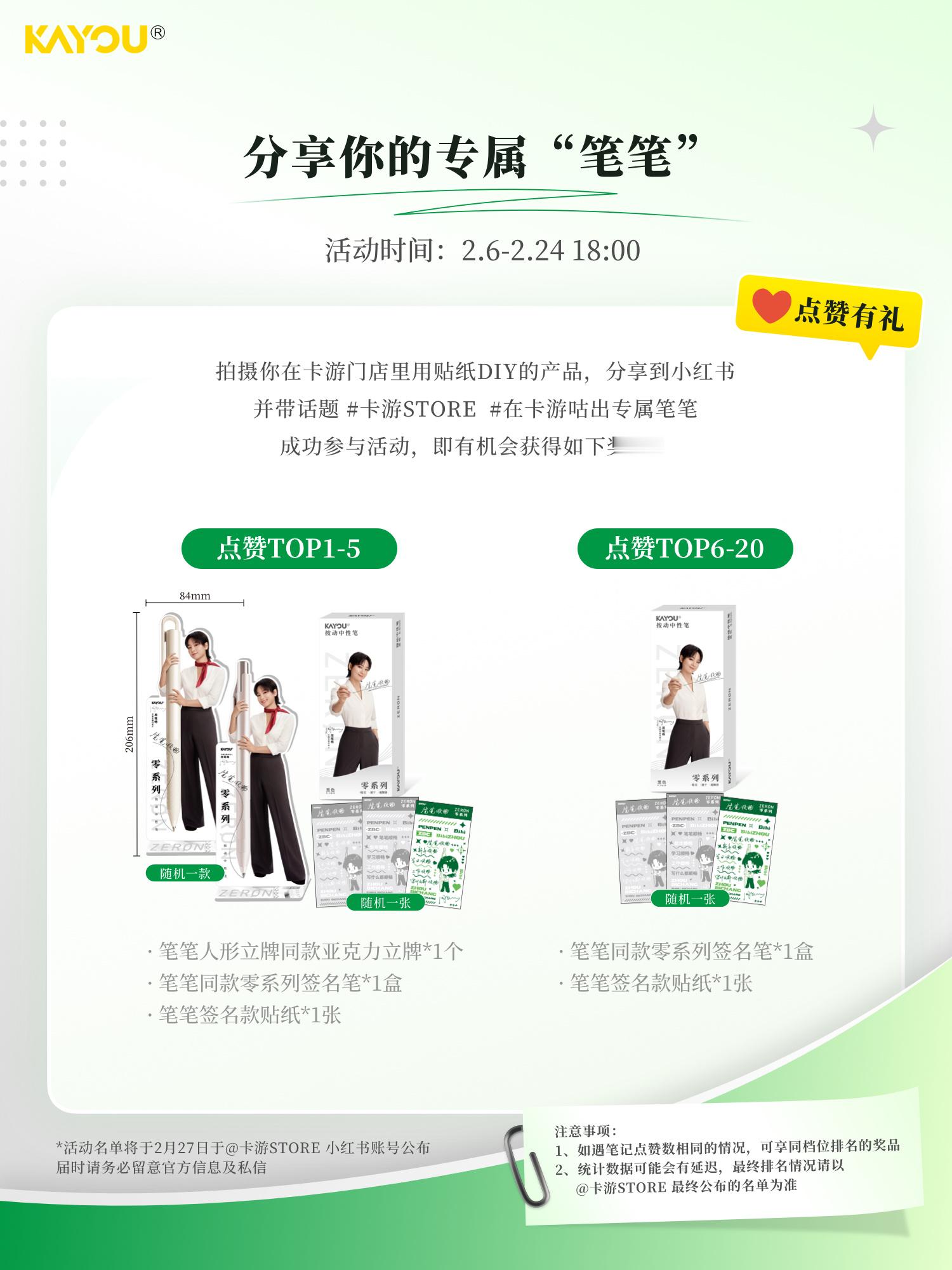 卡游STORE在卡游咕出专属笔笔卡游文具卡游卡游零系列和笔笔一起笔笔顺畅周笔畅哎?这是啥好东西啊,笔亲速来!2.6-2.8 2.13-2.23每天18-21点线下到店点击卡游小程序首页打卡就能100%获得周笔畅签名款贴纸兑换券,还有机会的PR拍立得一张,啥也别说了俺速速去打卡get签名款贴纸回家diy专属“笔笔”了~