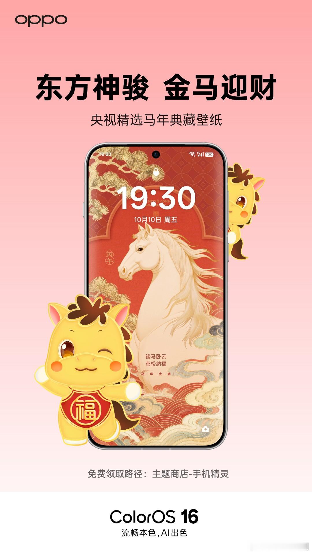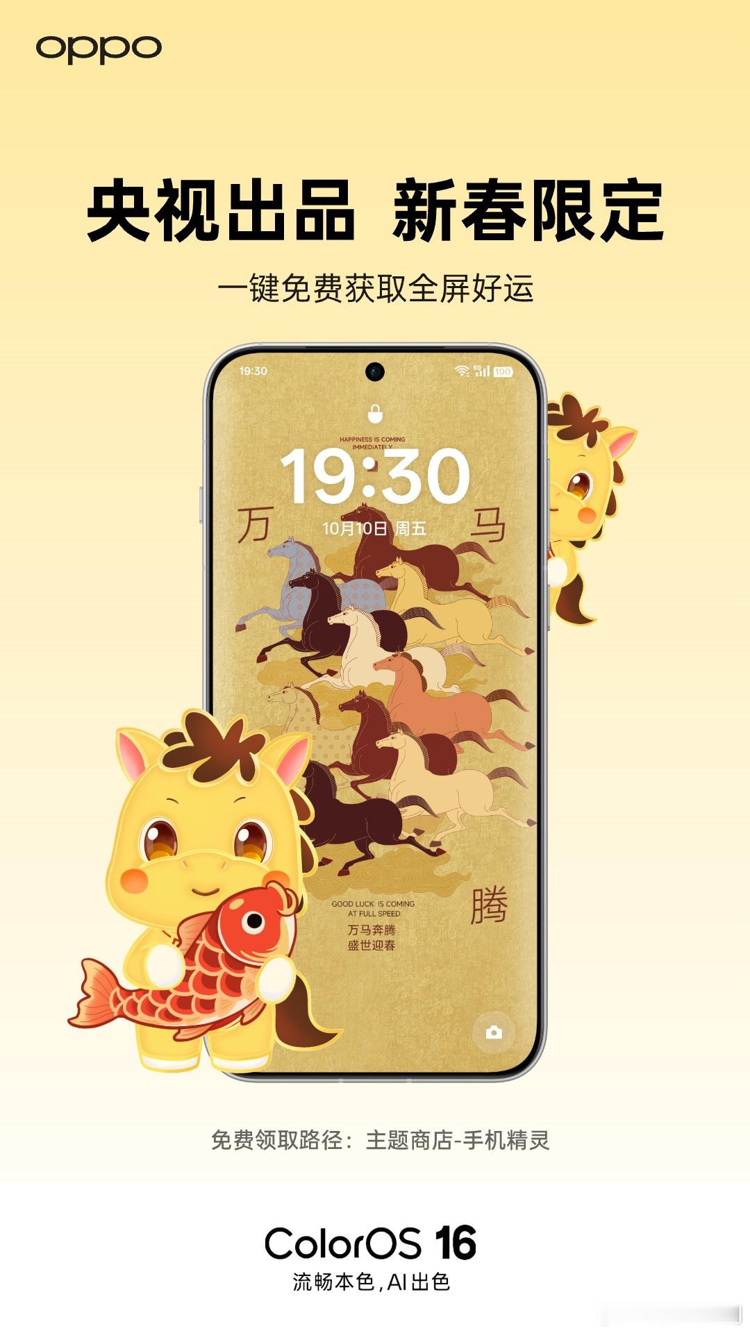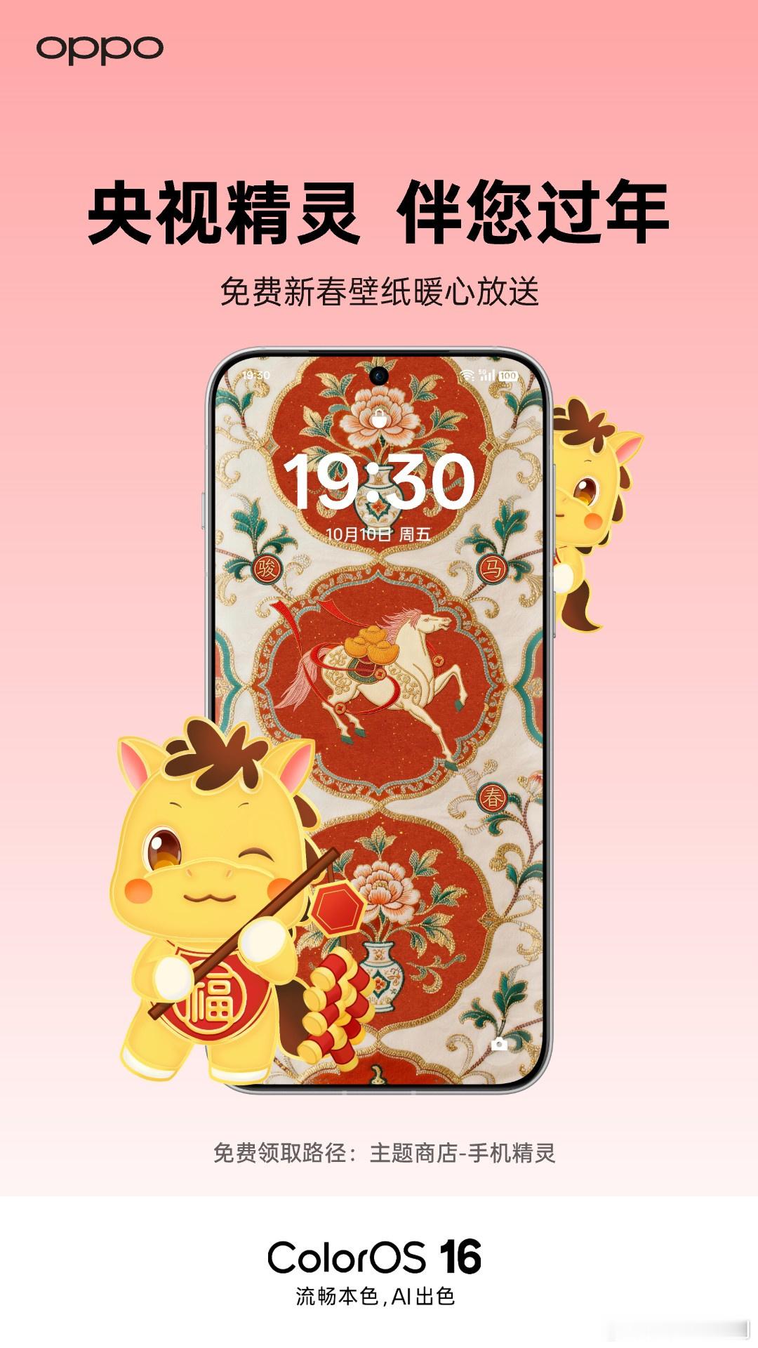 今年,让央视和OPPO陪你,为手机贴上一张会动的“马年窗花”!1️⃣ 手机精灵|马年贺春精灵 · 免费暖心送 ❤打开OPPO主题商店→ 首页进入【手机精灵】即可领取2️⃣ 经典传统纹样|解锁马年精美壁纸打开OPPO主题商店→ 点击中间【精选】→ 获取更多精美壁纸OPPO主题商店马年精灵免费领