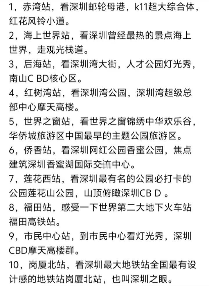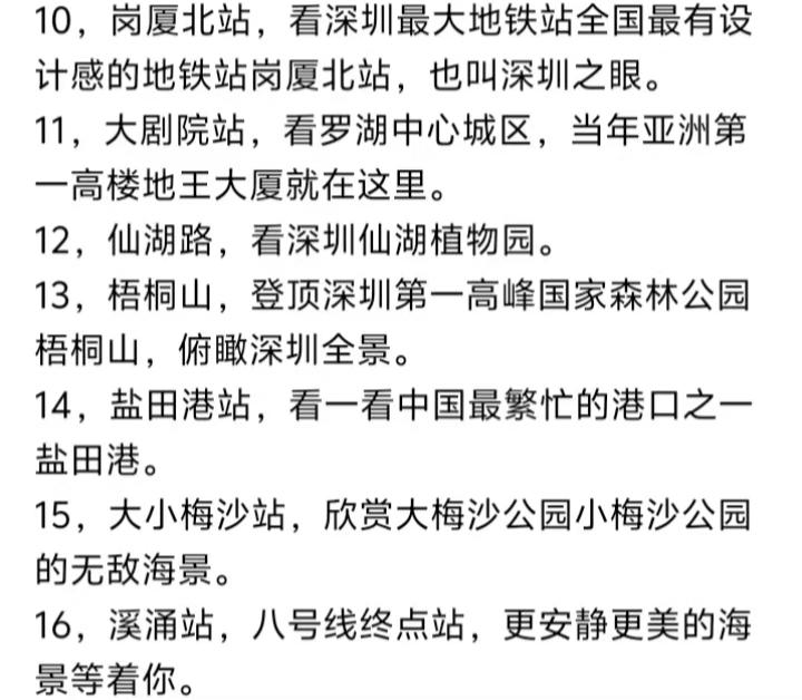 深圳地铁8号线(2号线),看山看海看城,名副其实的深圳地铁旅游第一线,从东到西穿过深圳主城区,串联起山海深圳。这条地铁线基本上囊括了深圳70%的著名景点,穿过了深圳城建风光最壮观的城区。包括南山中心区,人才公园,深圳湾公园,深圳湾超级总部中心,深圳香蜜公园(2026年APEC在这里举行),福田中心区,莲花山公园,深圳市民广场灯光秀,深圳华强北,罗湖区蔡屋围金融中心区,仙湖植物园,梧桐山,大梅沙小梅沙,溪涌,这个总结已经非常全面了,深圳深度游可以参考一下。