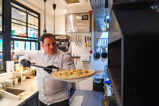 萨姆·罗西很忙。上午9点半,面试一位菲律宾应聘者,为新店做准备;10点,接受媒体采访,其间还处理了几个电话会议;11点,他兴致高昂地撸起袖子进后厨一展才艺,片刻之后,一个马年限定的松露萨拉米披萨就出炉了。
