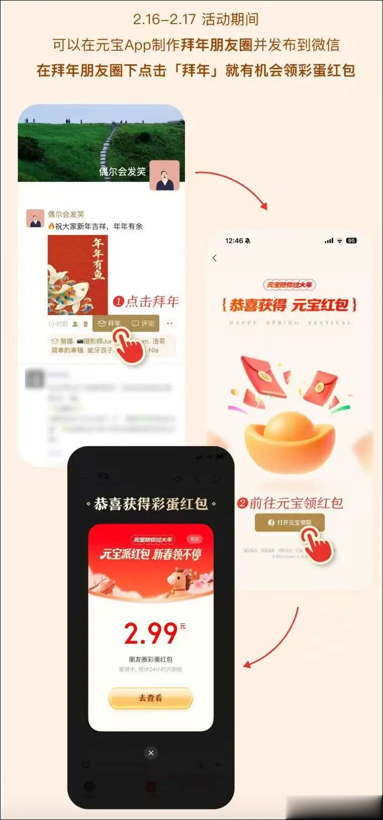 2月16日,腾讯张军发文称:很多人问,金色朋友圈怎么弄。操作指引来了,现在元宝里制作“拜年朋友圈”并发表,这样就可以触发。给别人的金色朋友圈点赞,还有机会掉落红包。