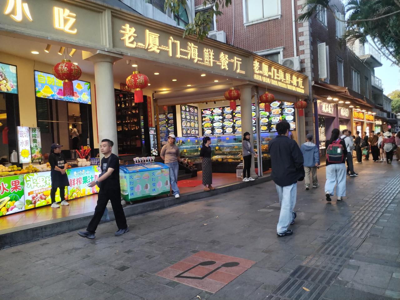厦门鼓浪屿游(三) 在站在鼓浪屿丽岛岸边,遥望国际大都市厦门夜景,灯火璀璨,让人赏心悦目,目不暇接。 登岛后,走马观花的逛了2个小时,人也累了,肚子也饿了。 远处阵阵海鲜味,扑鼻而来。这就是鼓浪屿岛上的著名海鲜小吃一条街。 随便找一家店铺,各种海一应俱全,任你品尝。 先尝一尝蟹黄小笼包,垫垫肚子。鲜香多汁蟹包,不要急于进嘴,先咬破皮,凉一下热气,再细嚼慢咽,吸一口汤汁后,才觉得蟹黄味的鲜美。 一家海鲜铺,四菜一汤,一家人酒足饭饱,也该打道回府了。 傍晚6,30分,夜幕降临,踏上返岸的轮渡后,8点起程,经过1,5小时的行驶,结束了夏门鼓浪屿的旅行。 厦门国际化的现代大都市,鼓浪屿更是闻名遐迩,享誉中外。 再见了厦门,再见了鼓浪屿丽岛。