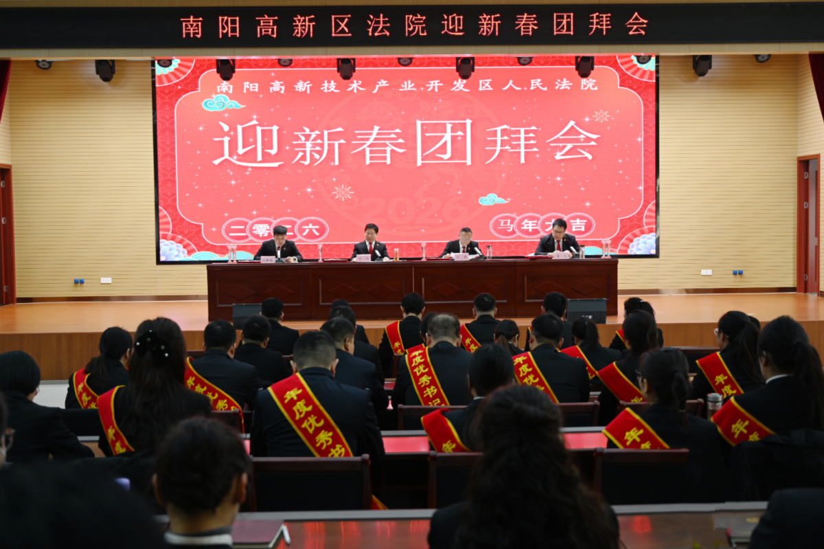 灵蛇衔福辞旧岁,骏马驰梦启新程。2月12日上午,南阳高新区法院召开2026年迎新春团拜会,全面回顾总结2025年工作成效,并对2026年重点任务进行初步部署。会议由院分党组副书记、副院长王磊主持,全体干警参会。