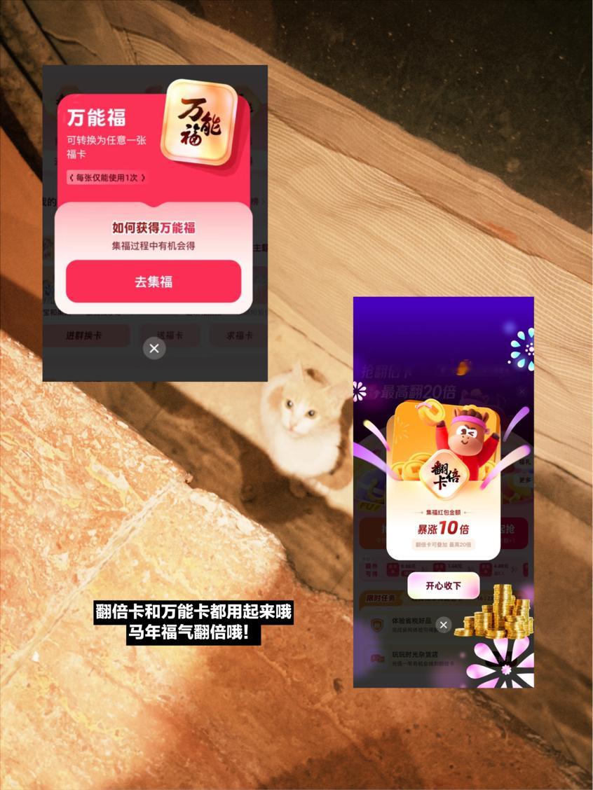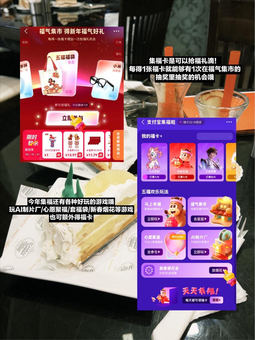 给你们整理了超省心小攻略:✅ 一定要冲万能福!9号开始大量放,能抵任意福卡,凑套超快✅ 去福气集市薅羊毛!每得1张福卡就多1次抽奖机会,周大福金条、天猫超市卡等超多好礼,集齐主题套卡还能解锁对应周边✅ 玩AI制片厂、心愿聚福、套福袋、新春烟花这些小游戏,也能额外拿福卡,一样能抽奖