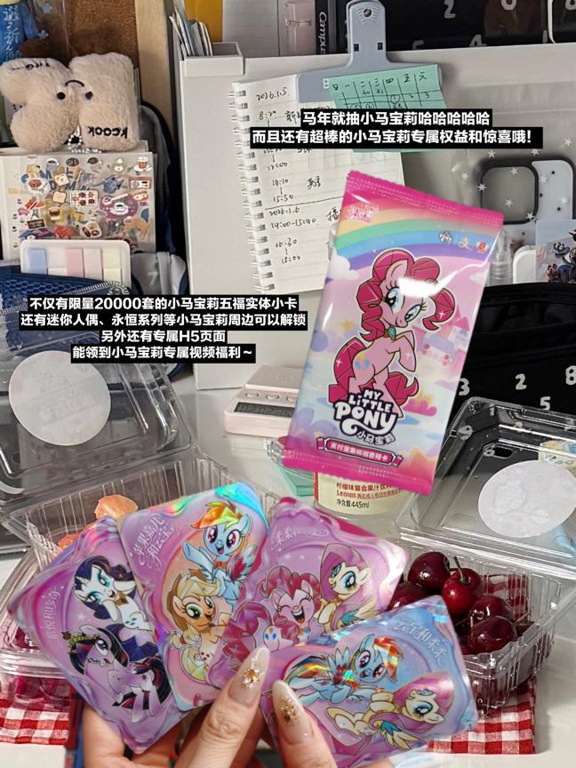 还有超多小马宝莉专属惊喜:限量20000套小马宝莉五福实体小卡、迷你人偶、周边都能解锁,还有专属H5和小马宝莉视频福利,直接可爱拉满!