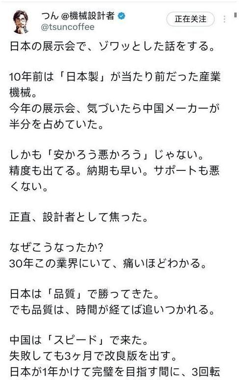 日本这下该彻底慌了!2月2日,一位有着30年机械设计经验的日本工程师发文:“在日本的展会上,说起让人心里发毛的一幕:十年前,‘日本制造’还是产业机械里理所当然的金字招牌。可今年的展会,一抬头,中国厂商已经占了半壁江山。而且早已不是‘便宜没好货’。身为设计师,说实话,我慌了。十年后又会怎样,难以想象。” 东京时间2月2日,当那位在行内摸爬滚打了30年的日本机械设计师走进会场时,原本期待的“主场巡礼”瞬间变成了一场巨大的心理震荡。他习惯性地抬起头,试图在巨大的展馆里寻找那些象征着工业皇冠的日系Logo,结果映入眼帘的,却是漫山遍野的汉字招牌。 这种视觉冲击是物理级的。整整50%的展位面积被中国厂商占据,从重型车床到精密的五轴联动中心,把过道挤得水泄不通。这位老工程师在社交媒体上敲下了一段让无数日本同行脊背发凉的文字:“十年前,‘日本制造’在这里是理所当然的统治者。今天,这种‘理所当然’变成了我心里的恐惧。” 真正令他心慌意乱的,并非展位内的摩肩接踵、拥挤不堪,而是长久以来构建的认知大厦在瞬间轰然崩塌,那才是让他内心惶惶不可终日的根源。昔日被冠以“廉价、低质”之名的竞争对手,仿佛经历了一场蜕变。如今,它已然撕下旧标签,换上了“精良”与“极速迭代”的崭新外衣。他不得不承认,这些中国设备不再是单纯的便宜货,而是在技术逻辑上完成了这一代人的追赶。 把时间轴拉回2023年,我们或许能看清这场“工业大撤退”的伏笔。当时的日本政府做了一个极其傲慢的决定:收紧对华五轴机床出口,把原本流畅的审批流程人为拖延至半年。 那时候东京的决策圈里流行着一种迷之自信,甚至有人放话:“没有日本的高端机床,中国连航母都造不出来。”在他们眼里,这是一种扼住对手咽喉的精妙战术,只要断了供,中国的工业升级就会像缺氧的火苗一样熄灭。 然而,商业世界的逻辑从来不以政客的意志为转移,回旋镖打在自己身上时往往最疼。这种人为的“断供”,不仅没有憋死中国制造,反而炸出了一个全产业链闭环。 既然买不到,那就自己造。被逼到墙角的中国企业开始死磕主轴、导轨和数控系统这些核心痛点。结果怎么样?C919大飞机飞起来了,福建舰下水了。那些曾经被日本视为“不可替代”的技术壁垒,在生存本能面前被一一推平。 数据是不会撒谎的,虽然它总是冷酷得不近人情。这场历时三载的博弈,影响立竿见影。日本对华精密机床出口额急剧下滑,惨遭腰斩,高达1112亿日元的巨额资金就此化为乌有,着实令人唏嘘。 更惨烈的画面发生在产业链的末端。2025年11月,也就是去年,日本核心机械订单环比锐减11%。如此巨大跌幅,创下2020年4月以来新高,凸显出令人忧虑的经济颓势,前景着实堪忧。 如果你有机会去发那科(Fanuc)的仓库看一眼,或许会更直观地理解这种绝望:因为积压太多,昂贵的精密机床只能披着防雨布露天堆放。而在供应链的底层,4000多家日本中小零件厂已经在寒冬中倒闭,成了时代的炮灰。 这无疑是一场冷酷无情的“技术达尔文主义”实验。在这场实验里,技术遵循着优胜劣汰的法则,尽显残酷本色,仿佛是一场没有硝烟却激烈异常的角逐。中国机床现在的精度已经可以做到0.001毫米级,在无故障运行时间上更是追平了国际顶尖标准。 然而,此般情形尚非最为致命之状况。真正的致命因素,实则在于价格。在性能相当的前提下,中国设备展现出显著的价格优势。其售价仅为日本同类产品的三分之二,相较之下,甚至低出20%-30%。于全球买家而言,此绝非一道需审慎权衡的选择题,而是一道不费吹灰之力便能得分的送分题,答案清晰明了。 市场正以实际行动作出选择。在刚过去的2025年,湖南面向中东地区的工程机械出口呈现强劲增长态势,增幅高达22.7%。沙特的地铁项目、中东的基建大单,这些原本属于日本企业的“自留地”,现在正被来自中国的集装箱填满。即便日本厂商试图降价挽尊,但在已经成型的中国产业链成本优势面前,这种抵抗显得苍白无力。 这不禁让人想起上世纪80年代的旧事。昔日,日本妄图以技术封锁扼杀韩国半导体产业。然而事与愿违,此举反倒催生出强大的三星。日本自食恶果,亲手终结了自身在该领域的垄断时代。 如今的历史剧本似乎正在重演,只不过这一次,对手的体量要大得多,反击的力度也狠得多。文末,那位日本老工程师留下“十年之问”,其答案实则已呼之欲出。此问虽悬于纸面,答案却似隐于字里行间,即将跃然而出。 何须苦待十载春秋。关键转折之年,便在当下——2026年。这一年,将开启新局,无需漫长守候,变革已然近在咫尺。 信息来源: 全国党媒信息公共平台,《“制作精良、交货迅速、售后到位”,日本网民热议中国制造业“迭代快”》