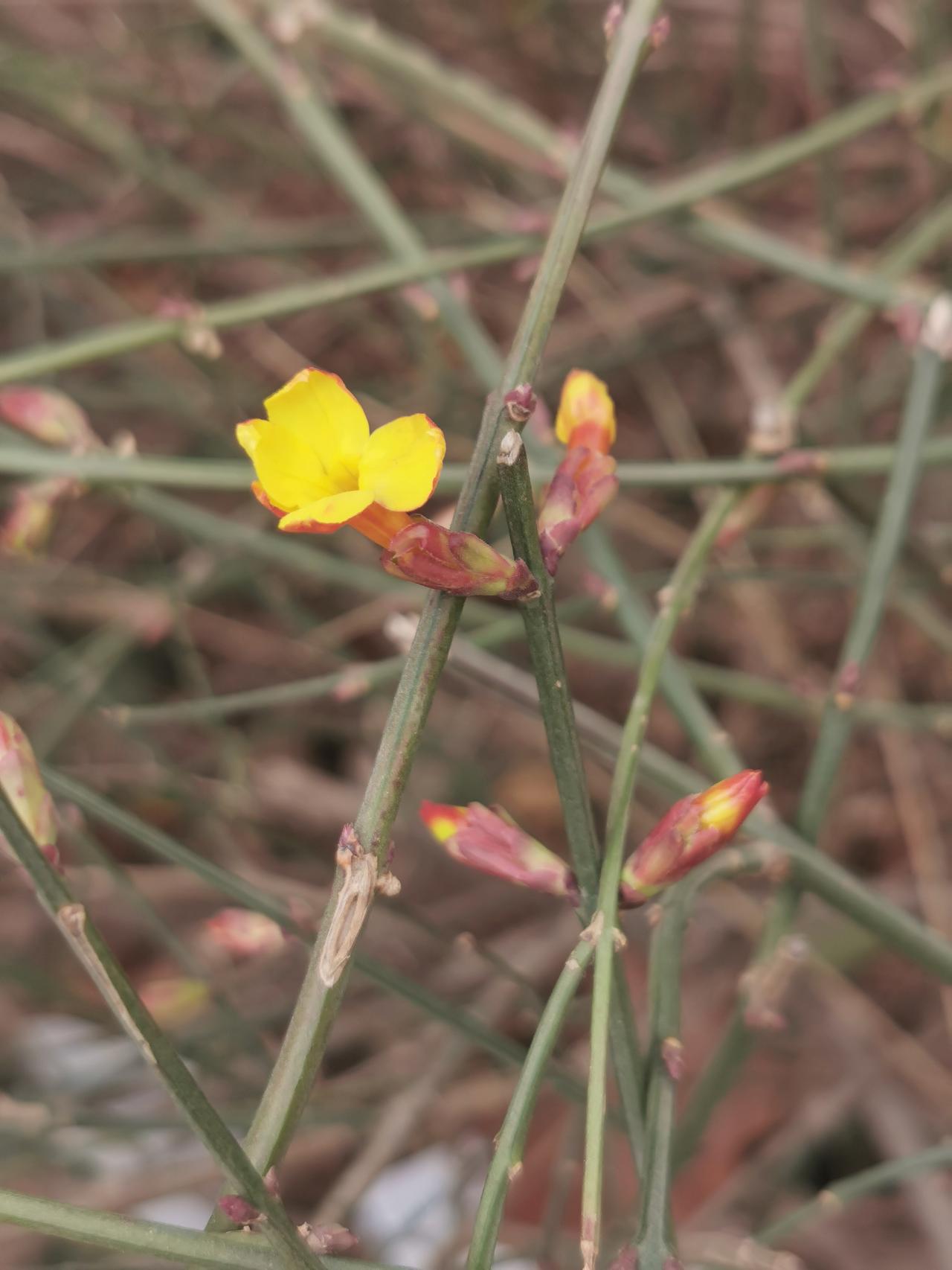 除夕迎春! 今天除夕,刚才出来到院子里的小花园散步,偶然看到迎春花已经点