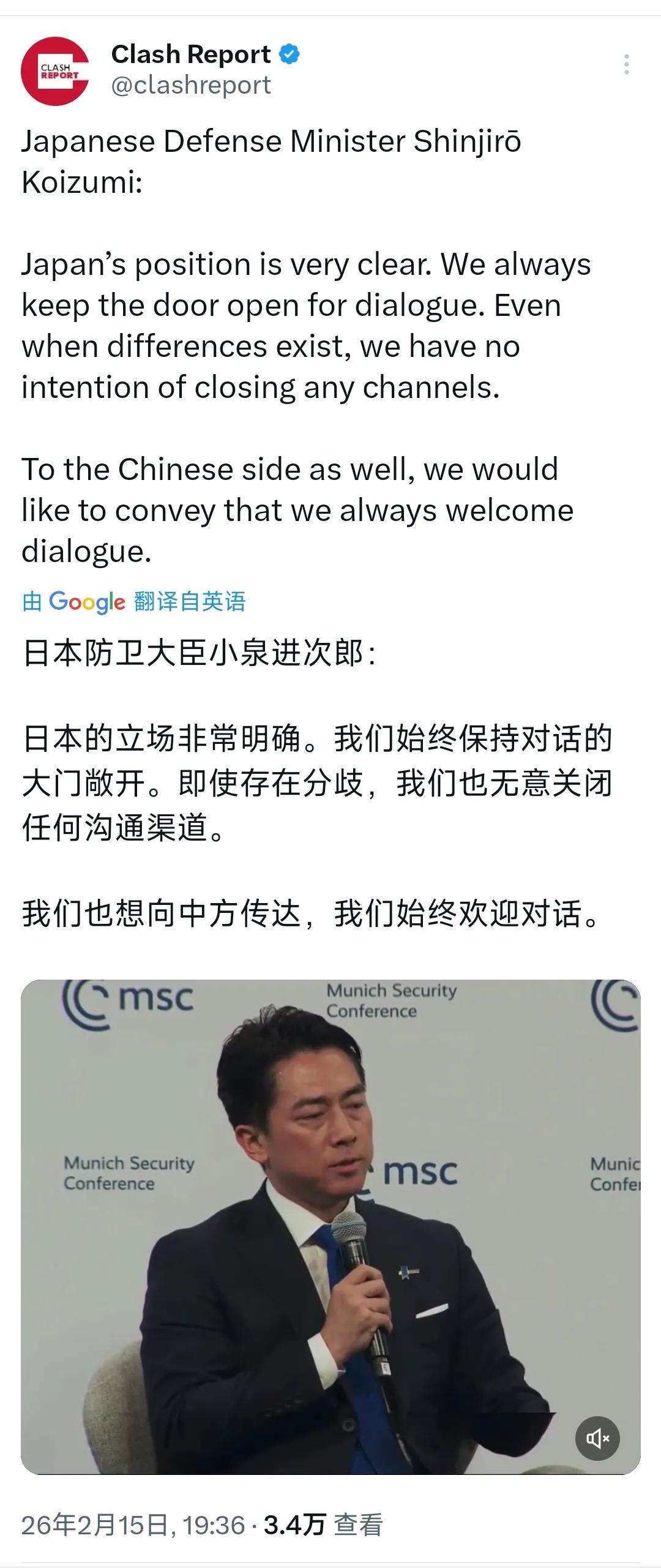 日本急着要与中国对话?就必须先回规正规后再说 2月15日晚,日本防卫大臣小泉进次郎却贡献了一场堪称“语言艺术”的表演:日本始终敞开对话大门,即使有分歧,也欢迎沟通。 听上去温良恭俭让。可这话从日本防卫大臣嘴里说出来,总透着一股子荒诞的喜感。 中日关系的剧本,什么时候轮到日本扮演“渴望沟通”的苦情主角了? 现实比台词更诚实。就在小泉深情呼唤“对话”的同时,日本自卫队与美军“坚决之虎25”联合演习的硝烟还未散尽。从九州到冲绳,新基地一个接一个破土动工,引进“战斧”导弹的预算一笔笔通过。更不用说在台海问题上,日本政客那些欲言又止的“担忧”,哪个不是在给本已复杂的局势添柴加火? 这就好比一个人拎着棍子把你家门砸了,转身却对着围观群众喊:“我始终欢迎和他坐下来喝茶聊天。” 真正让人厌倦的,正是这种“温和的姿态”与“锋利的动作”之间的巨大割裂。 翻开中日邦交正常化的历史,四个政治文件写得明明白白。可日本的实际行动呢?历史教科书问题,改了又退,退了又改;高市早苗大臣此前的严重挑衅言论,至今没有收回,更遑论道歉。这些积攒起来的“小动作”,早已堆成了一堵厚厚的墙。现在,日本代表站在墙那边喊“我们想对话”,声音再温柔,又有几分可信度? 中国当然欢迎对话。中国外交史上从不缺少“以诚相待”的篇章。但对话从来不是单方面的抒情诗,它需要双方共同谱写。它的前提是基本信任,是对方手里没有攥着刀子。 真正的对话勇气,从来不体现在慕尼黑灯火辉煌的会议厅里,而体现在是否敢于直面并修正自己的错误行动。日本如果真想打破僵局,最简单的诚意证明,就是停止在历史问题上反复拉扯,停止在军事部署上配合外部势力的遏华棋局。 小泉说“分歧存在,但不关闭沟通渠道”。这话没错。问题是,沟通渠道如今不是关闭了,而是被日本自己堆放的杂物堵住了。要疏通,需要的是行动上的清理,而不是嘴上再添几块漂亮的辞藻。 想对话?可以。把手里的棍子放下,把门前的障碍搬开。否则,再多“欢迎沟通”的表态,不过是演给自己看的独角戏罢了。