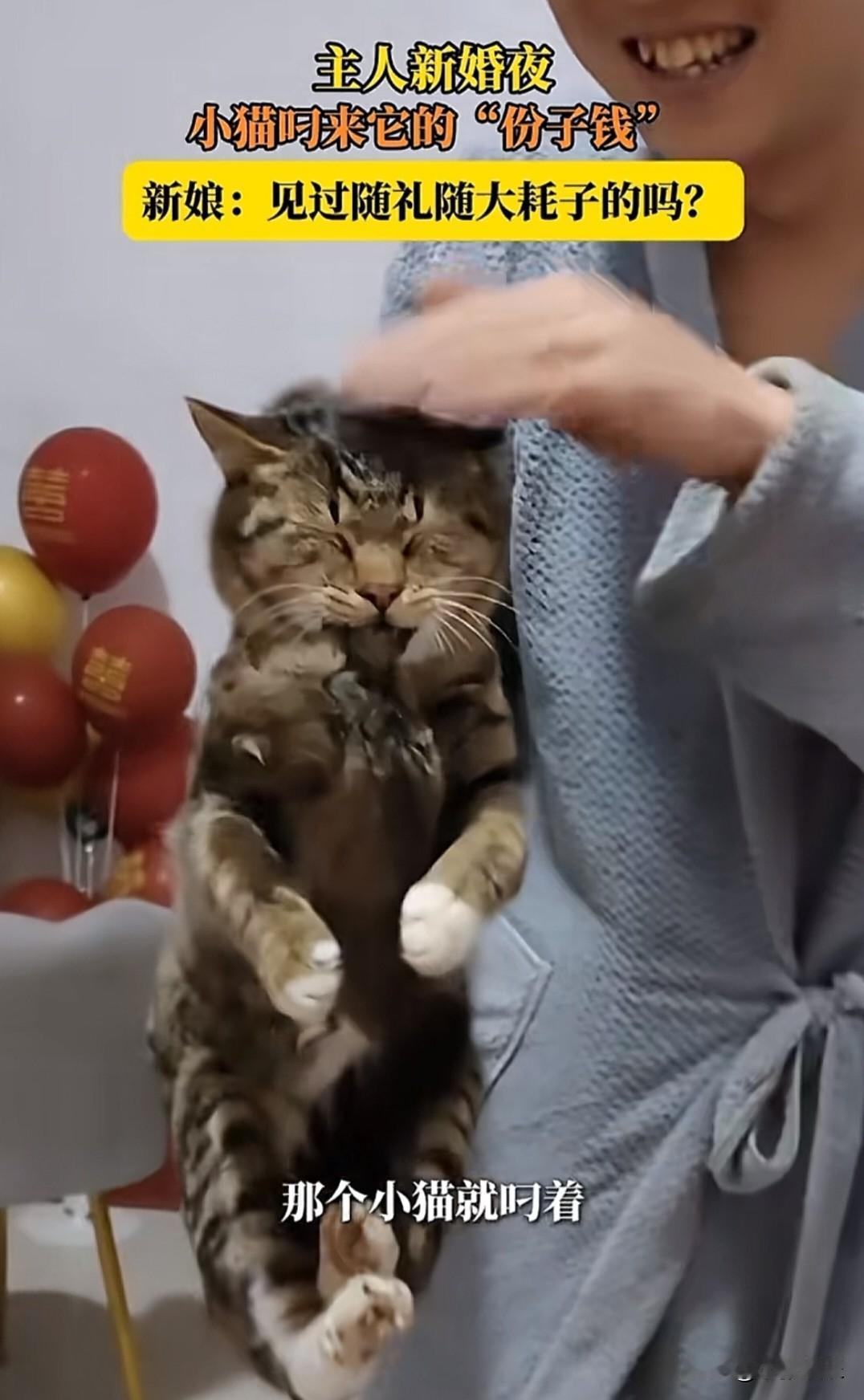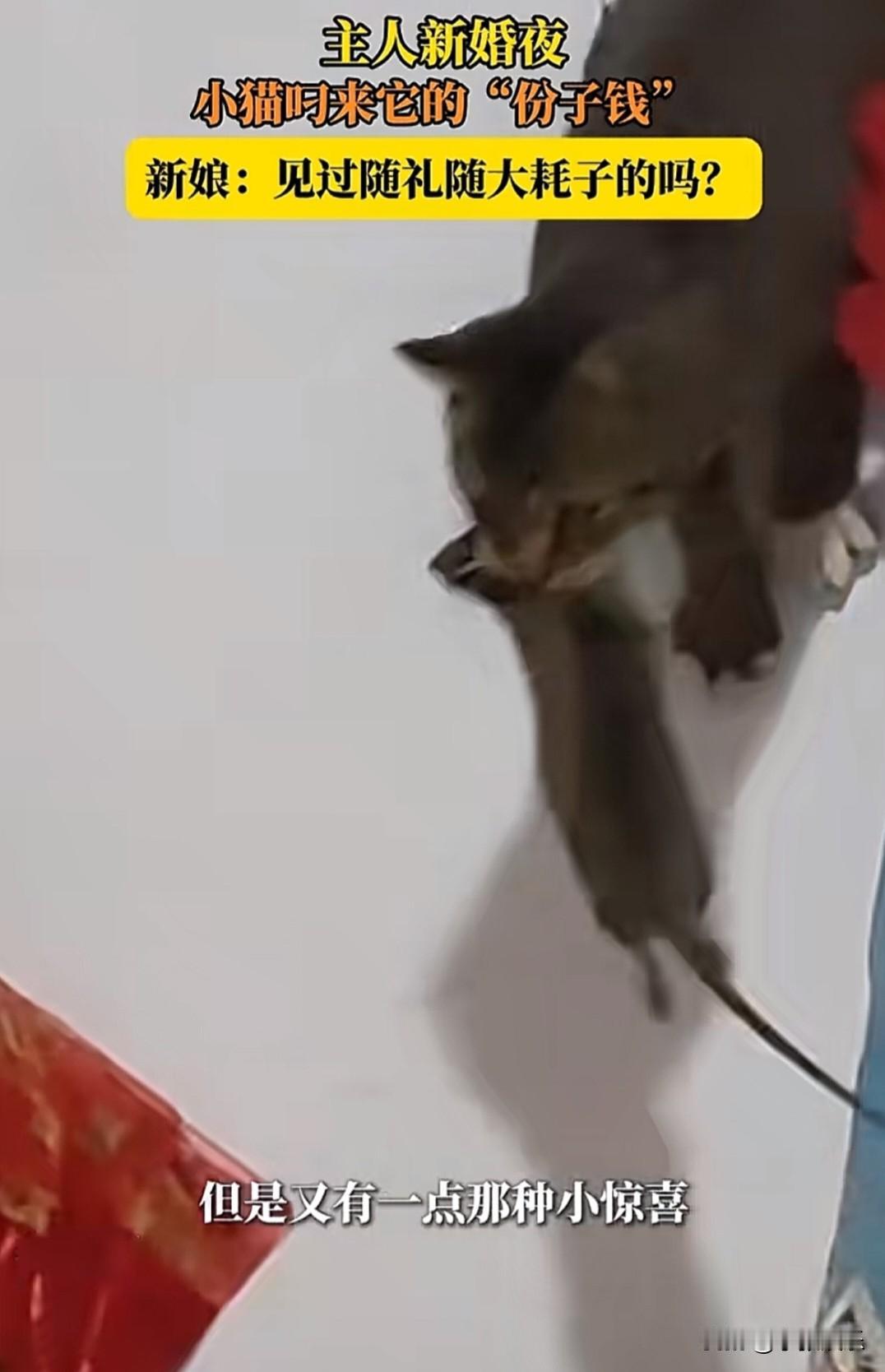 办过婚礼的都见过随礼的,但你见过随礼的……大耗子吗? 昨天,河北一场婚礼上就发生了这么件稀奇事。当晚上婚礼结束之后,老公家养的猫咪从窗口叼着一只大黑耗子过来随礼, 小猫挑的礼物还算可以,耗子体型巨大肥硕,有可能是小猫专门养肥了送给女主人的。 就算是男主人把他滴溜起来,它也没有放下嘴中叼着的耗子,可见其心意之诚 新娘看到后感觉又惊喜又害怕,怕的是怕老鼠。惊喜的是小猫咪心中有自己。 这送的哪是耗子呀,送的是女主人的家庭地位,是小猫的一片真心