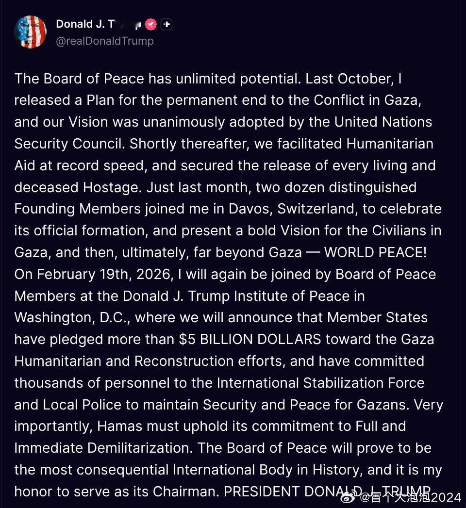 川普总统星期天(2月15日)在Truth Social写道,和平委员会成员定于2月19日在华盛顿开会,届时将宣布委员会创始成员承诺出资超过50亿美元,用于加沙人道主义和重建工程,并将派遣“数千名人员”加入一支稳定部队,以协助维护加沙安全。