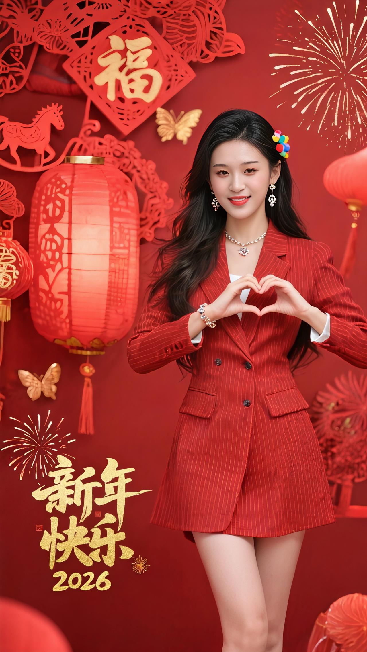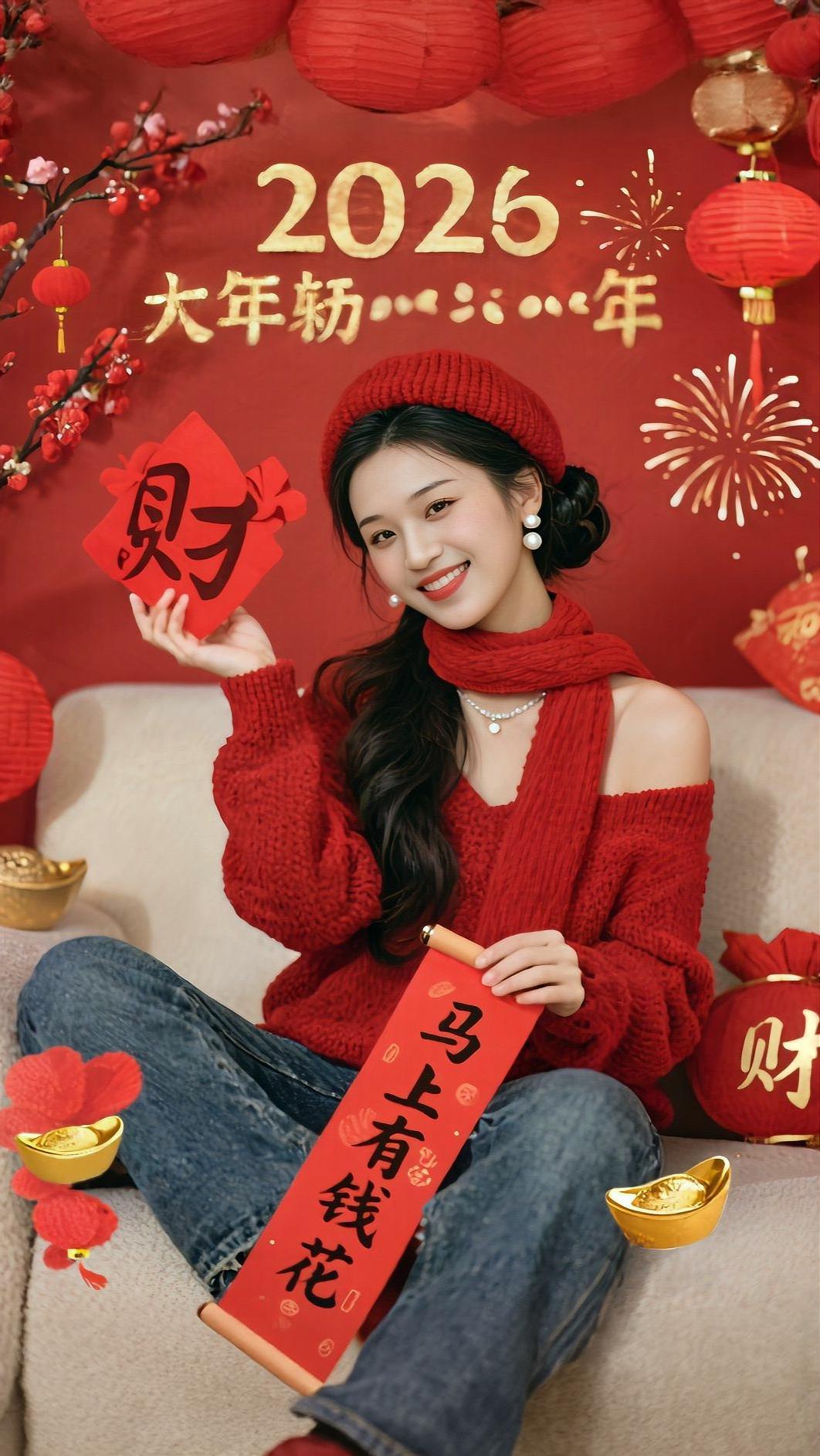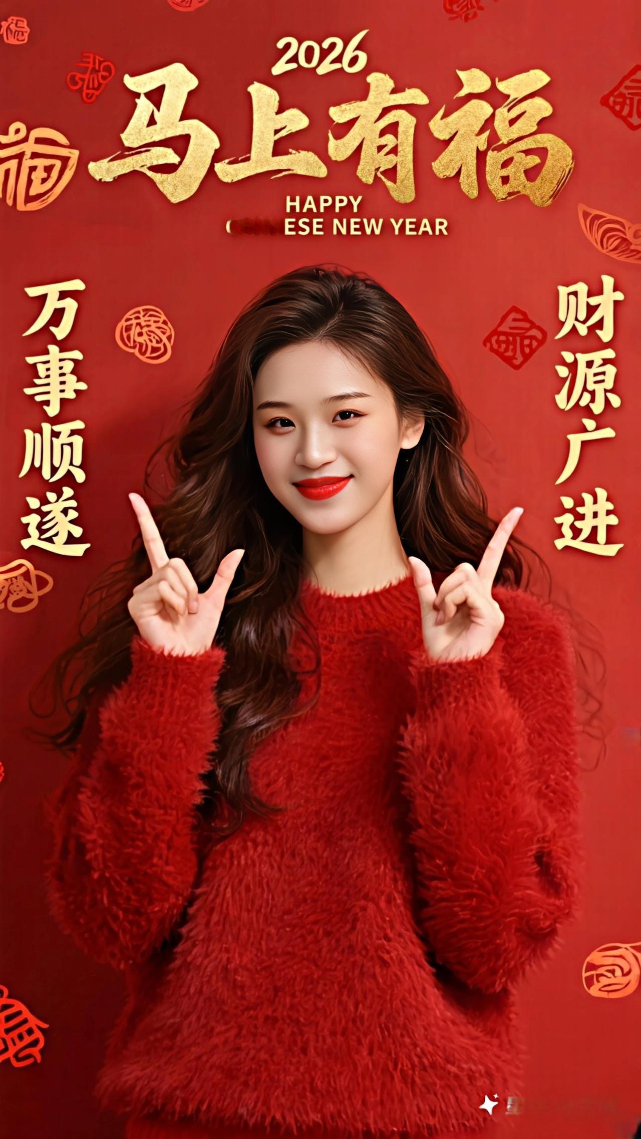 新年喜庆P图大赏 红妆一笑醉流年,漫卷云舒许大千。 金马扬蹄开泰运,春风送暖入家筵。 且将新愿折成扇,岁岁安康福满船。 红衣胜火,笑靥如花。 手握清风,许你一世荣华。 2026,马到功成,万事胜意。 我把2026的期许, 折进这把红色的扇子里。 灯笼点亮了除夕的夜, 烟火升腾起来年的喜。 不必借光而行, 你本就是星辰。 愿这一年的风, 都为你而来, 愿这马年的路, 尽是坦途与花开。 红衣出镜,自带光芒。 除夕快乐,在这个热烈的年份,我们都要闪闪发光。