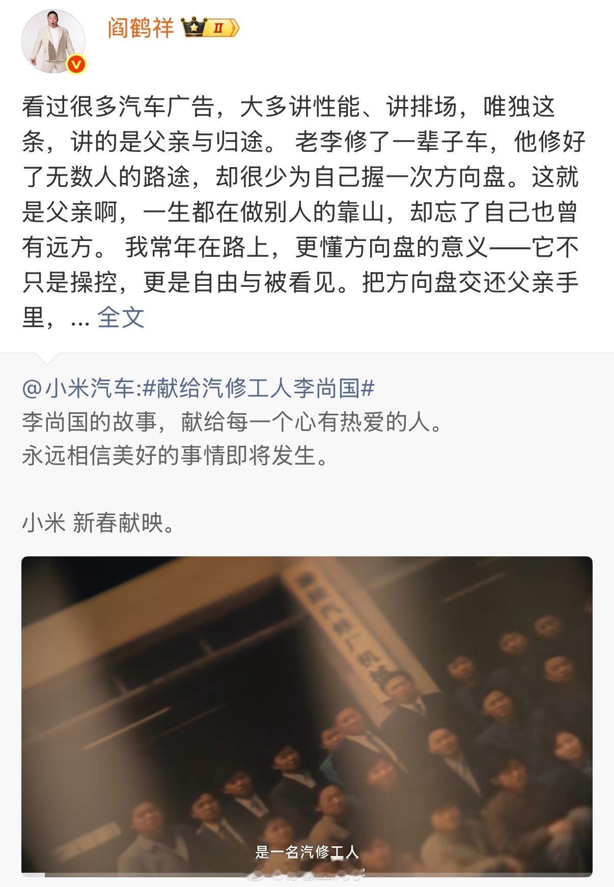 大家都看到小米汽车的这期视频了吧,刚刚看完和阎鹤祥狠狠共情了,正如他所说,在大部分车企都在讲参数,讲自己的故事的时候,小米汽车讲了他人的故事阎鹤祥式共情又上线了