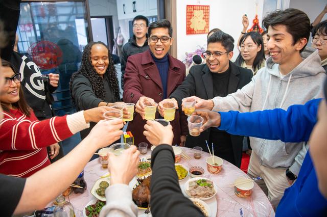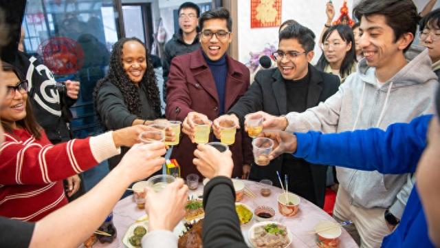 夜幕降临,漕泾的“在水一方”综合体内灯火通明,游客与留学生围桌而坐,互道祝福,共叙友情。本地村民张先生表示:“能和各国留学生一起在水乡过年,特别有意义。这不仅是一顿饭,更是中外文化暖心交流的美好时刻。”
