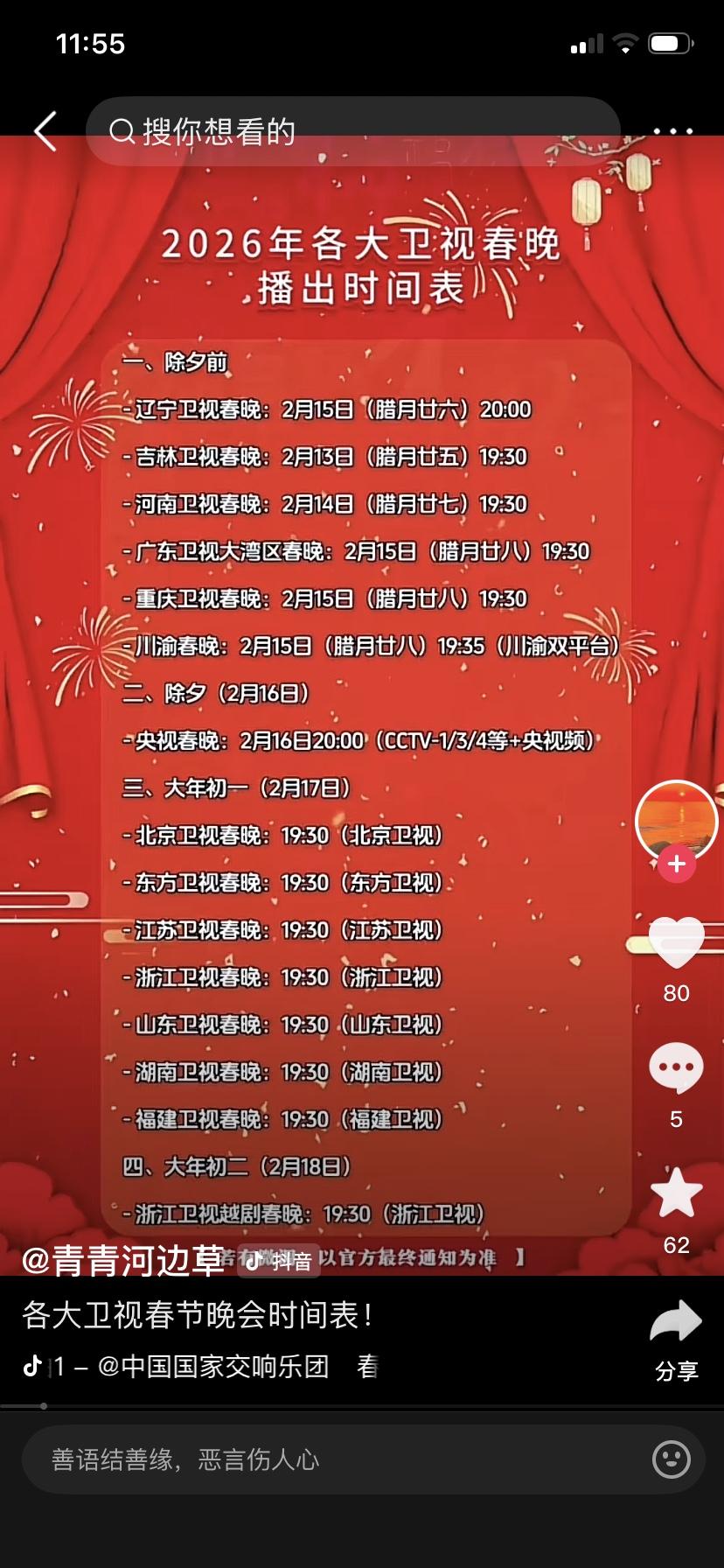 大家昨晚看春晚了吗? 各大卫视居然提前一天办春晚 头一次吧! 现在年味儿淡了 春晚也没人看了 反正昨晚我就随便逛了一圈 就没看了 真的觉得越来越没意思 现在春晚日期还提前一天 有点搞不懂了 大家看了吗?